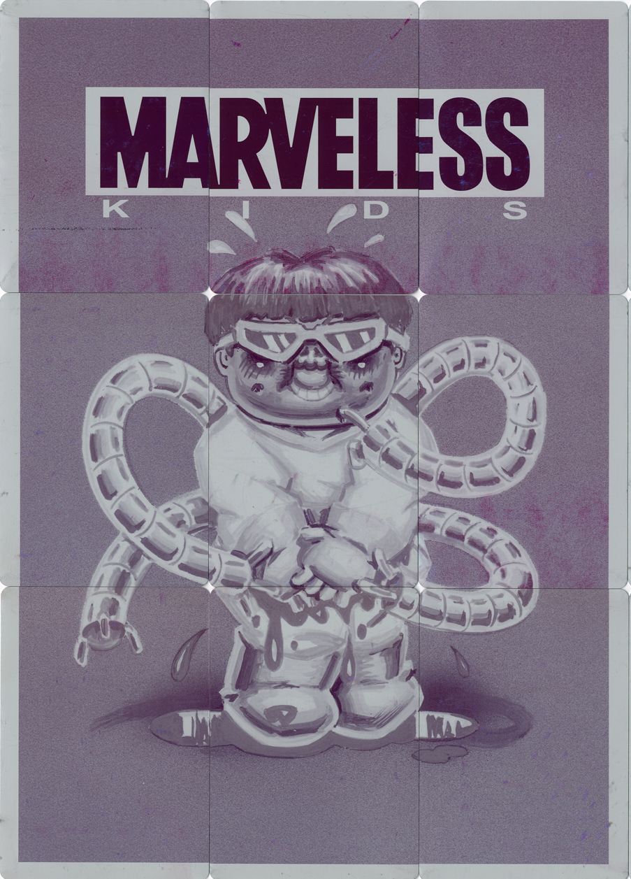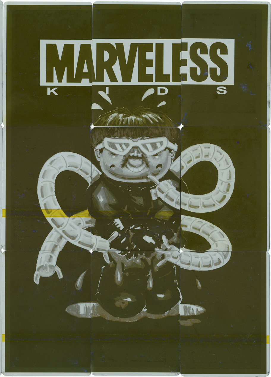 These 1/1 metal printing plates were used in the production of Marveless Kids, and were cut down to trading card size. There are 4 sets available - CYAN, MAGENTA, YELLOW, and BLACK. These 9 plate sets were used to print one of the 9 card back puzzles.