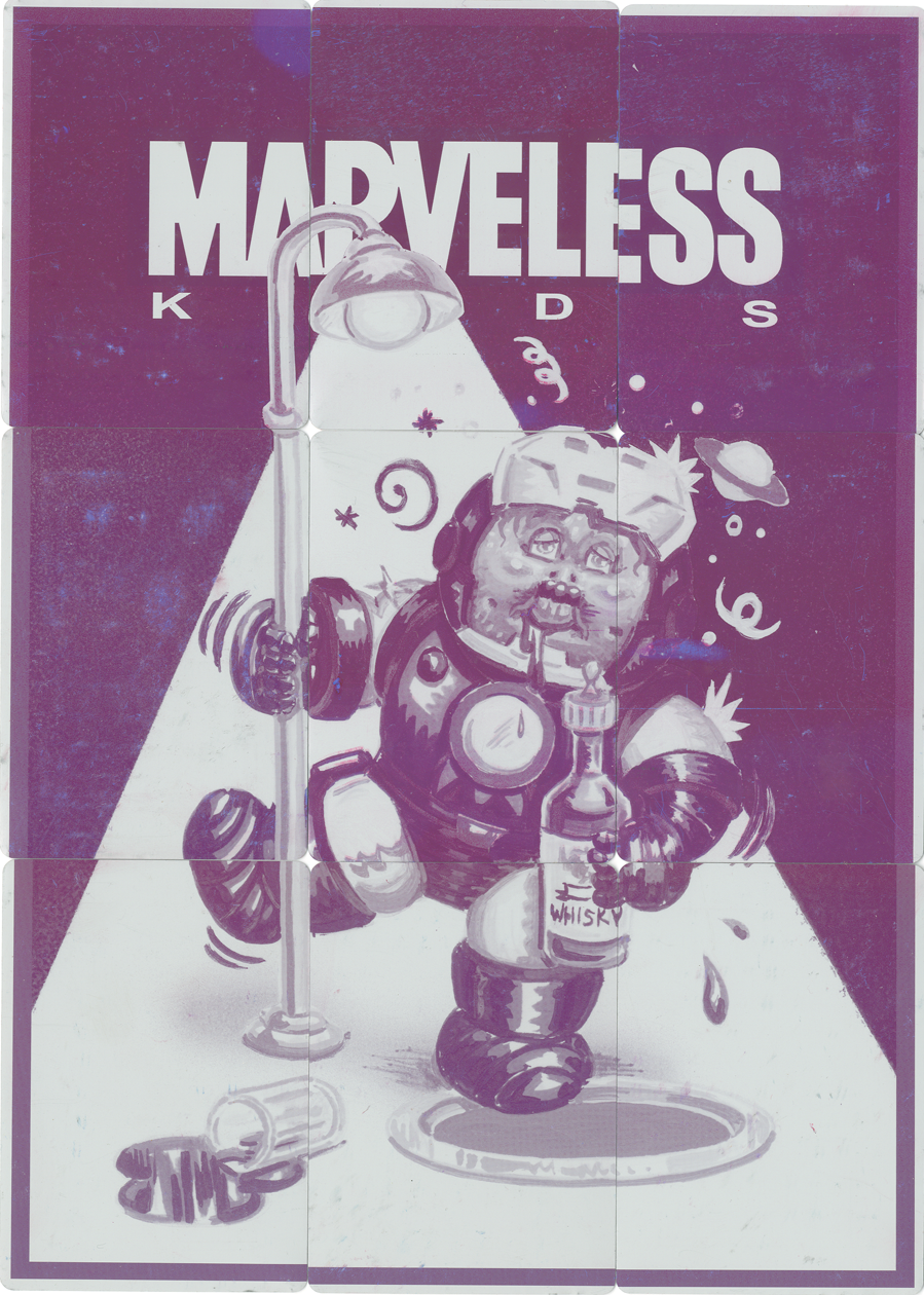 These 1/1 metal printing plates were used in the production of Marveless Kids, and were cut down to trading card size. There are 4 sets available - CYAN, MAGENTA, YELLOW, and BLACK. These 9 plate sets were used to print one of the 9 card back puzzles.