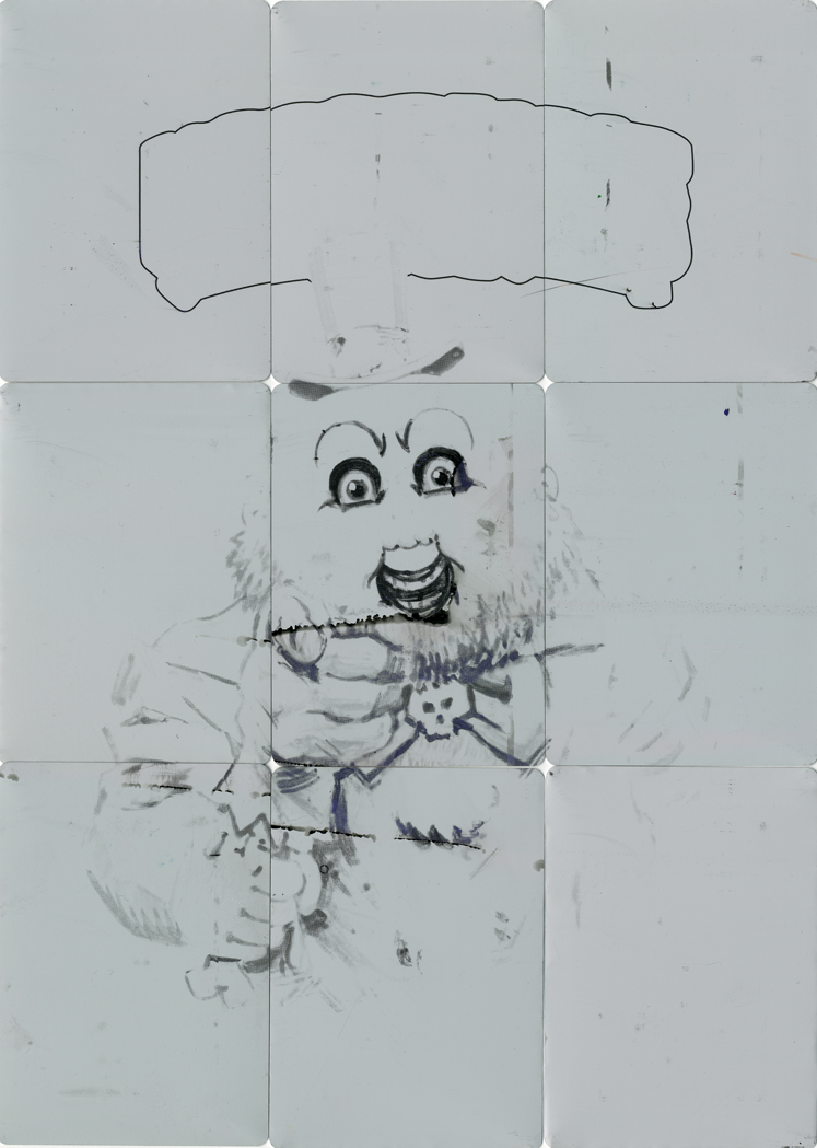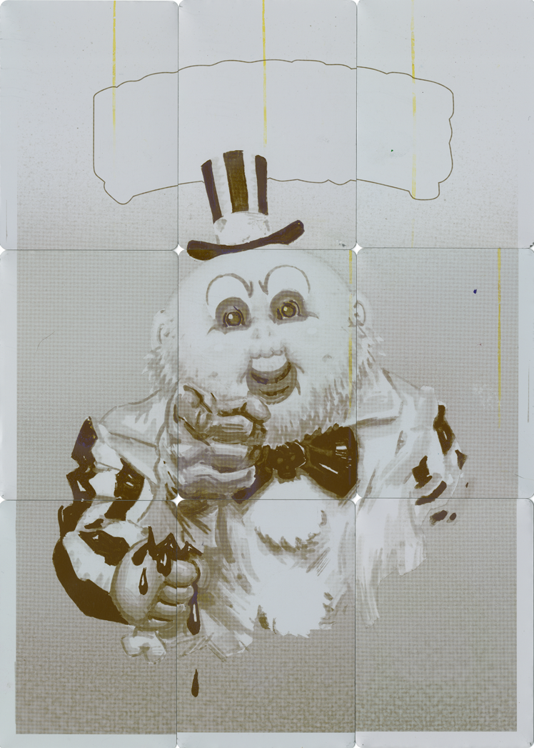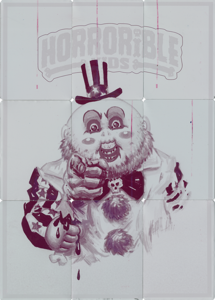 These 1/1 metal printing plates were used in the production of Horrorible Kids, and were cut down to trading card size. There are 4 sets available - CYAN, MAGENTA, YELLOW, and BLACK. These 9 plate sets were used to print one of the 9 card back puzzles.