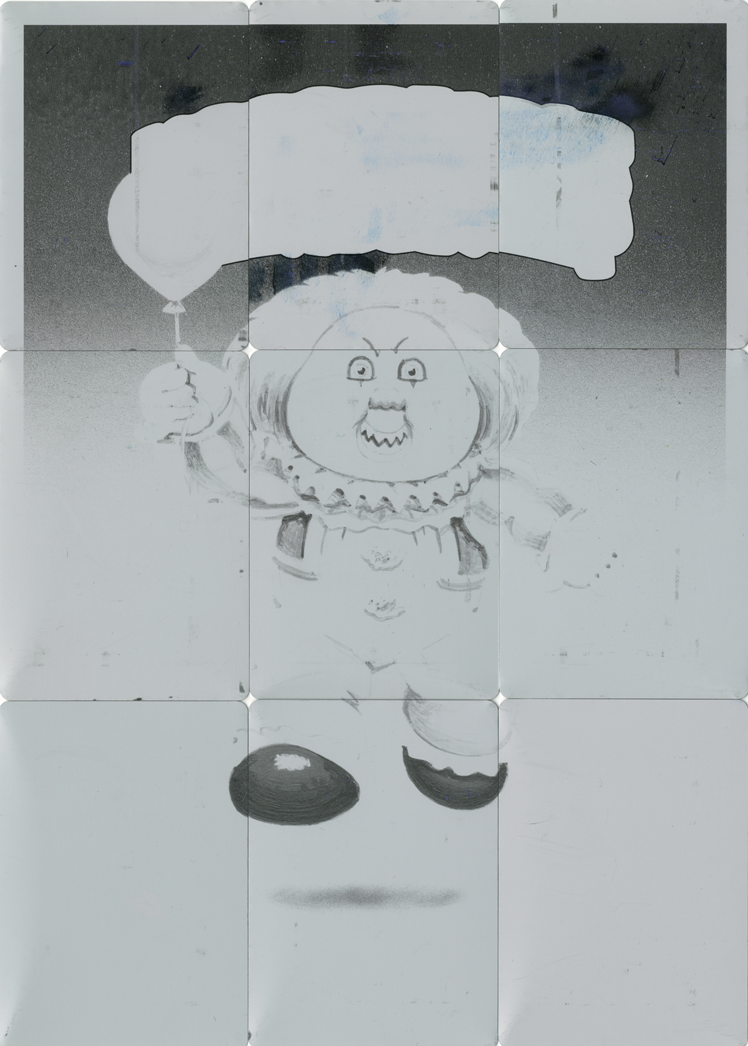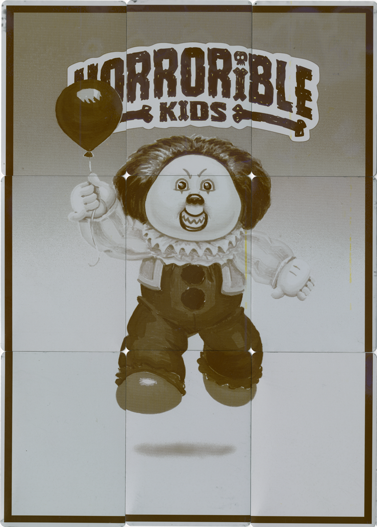 These 1/1 metal printing plates were used in the production of Horrorible Kids, and were cut down to trading card size. There are 4 sets available - CYAN, MAGENTA, YELLOW, and BLACK. These 9 plate sets were used to print one of the 9 card back puzzles.