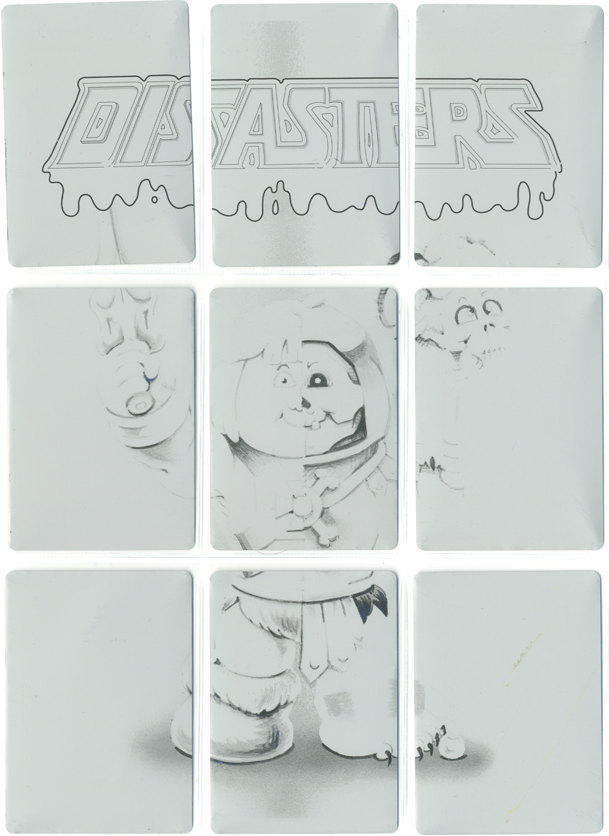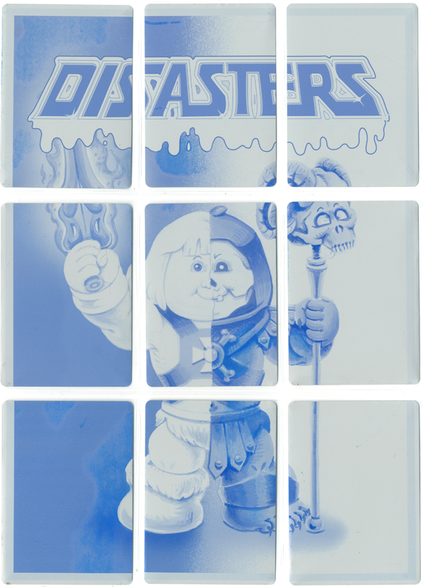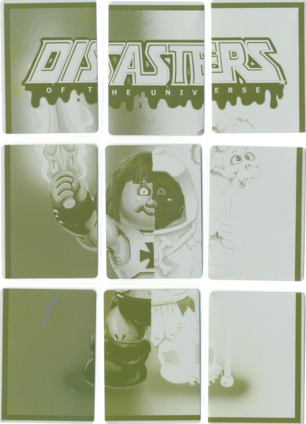 These 1/1 metal printing plates were used in the production of Disasters of the Universe, and were cut down to trading card size. There are 4 sets available - CYAN, MAGENTA, YELLOW, and BLACK. These 9 plate sets were used to print one of the 9 card back puzzles.