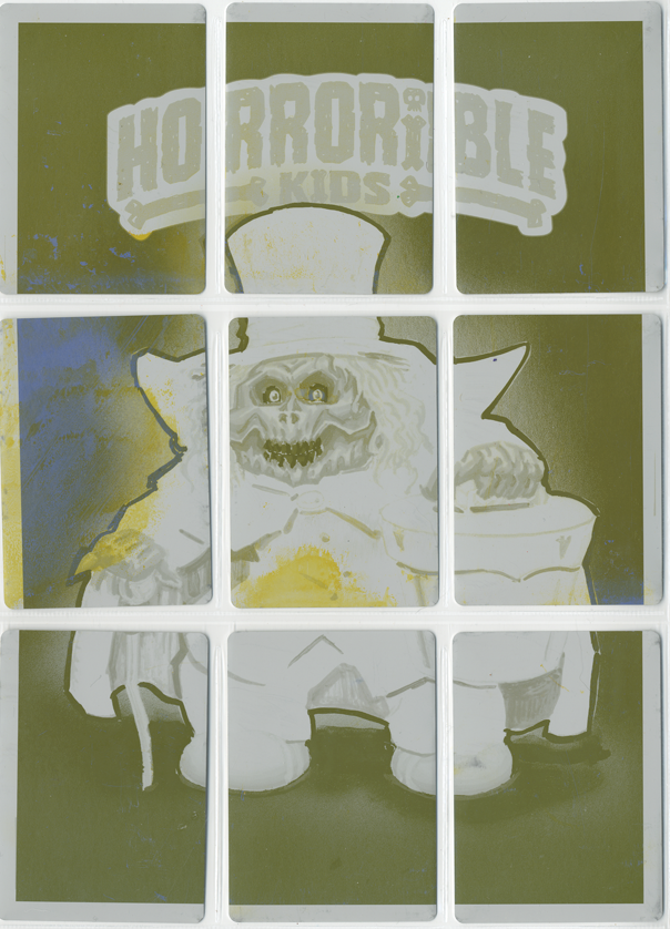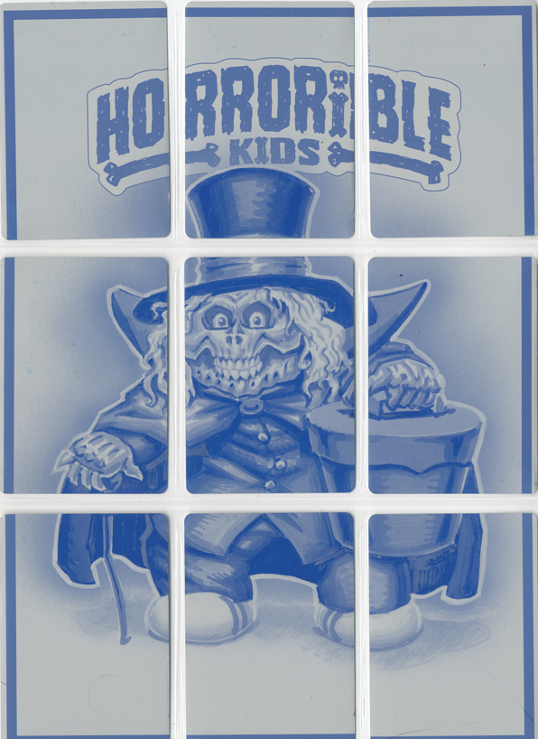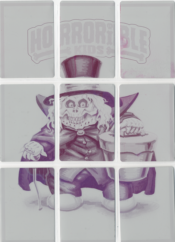 These 1/1 metal printing plates were used in the production of Horrorible Kids, and were cut down to trading card size. There are 4 sets available - CYAN, MAGENTA, YELLOW, and BLACK. These 9 plate sets were used to print one of the 9 card back puzzles.