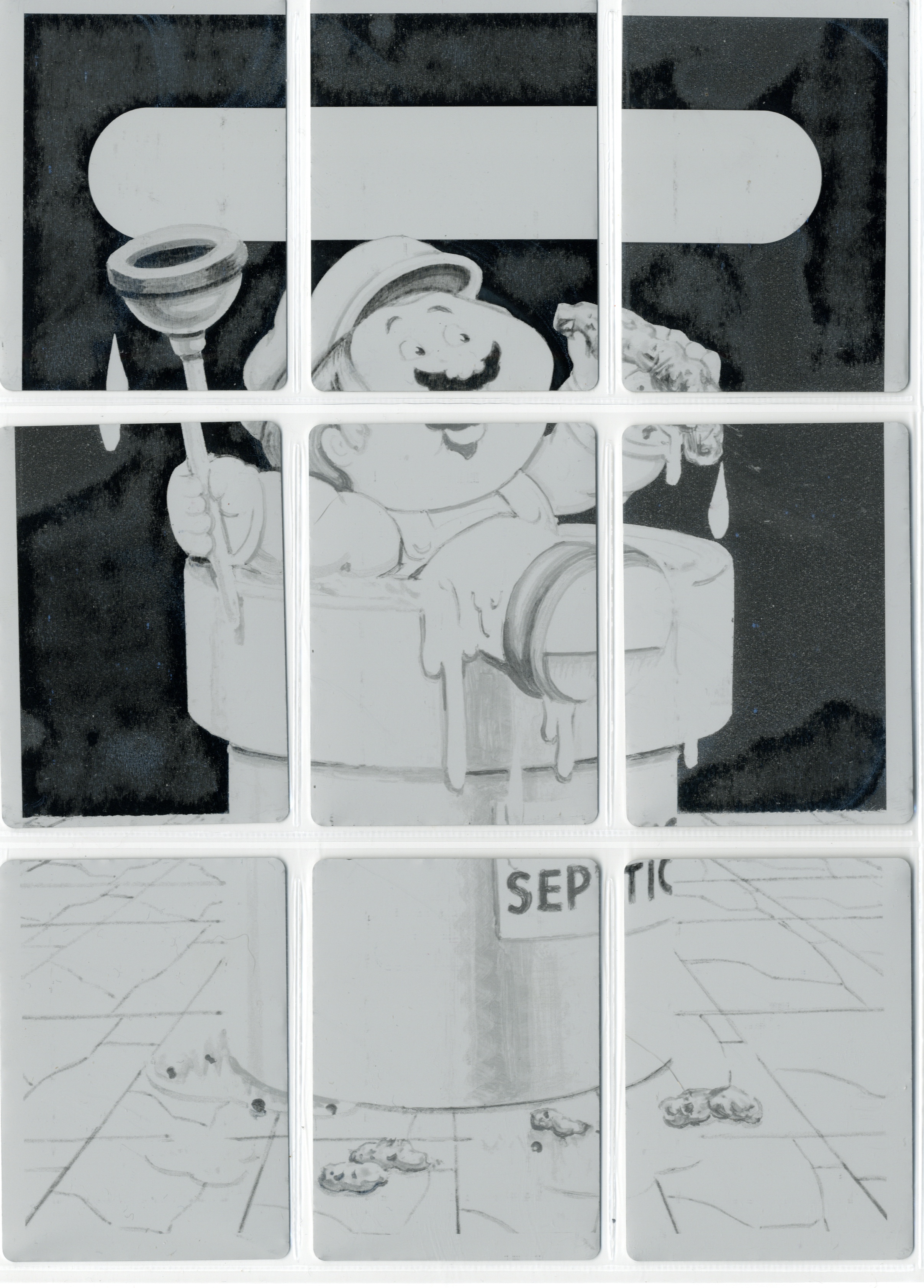 These 1/1 metal printing plates were used in the production of Nintendopes, and were cut down to trading card size. There are 4 sets available - CYAN, MAGENTA, YELLOW, and BLACK. These 9 plate sets were used to print one of the 9 card back puzzles.
