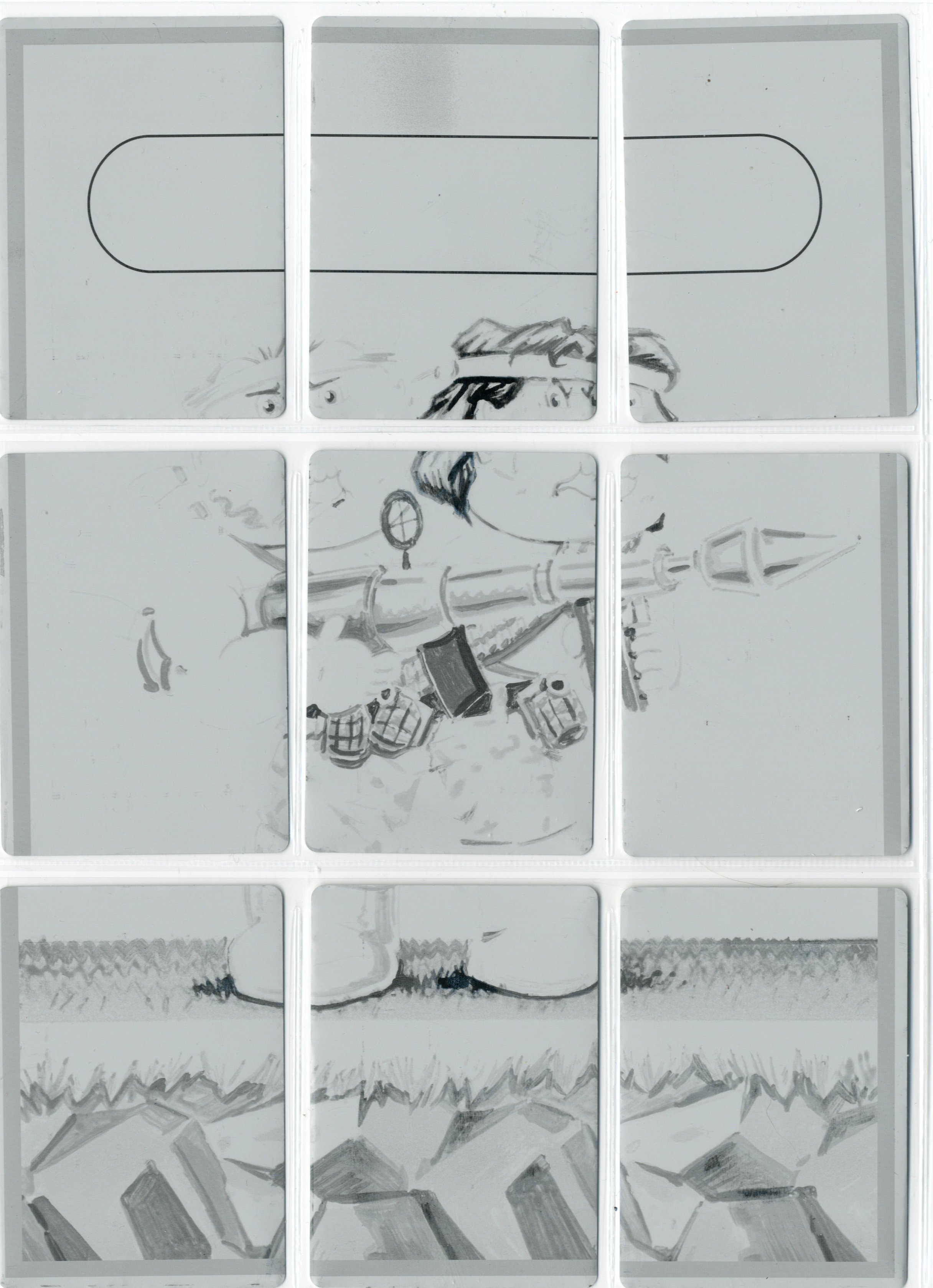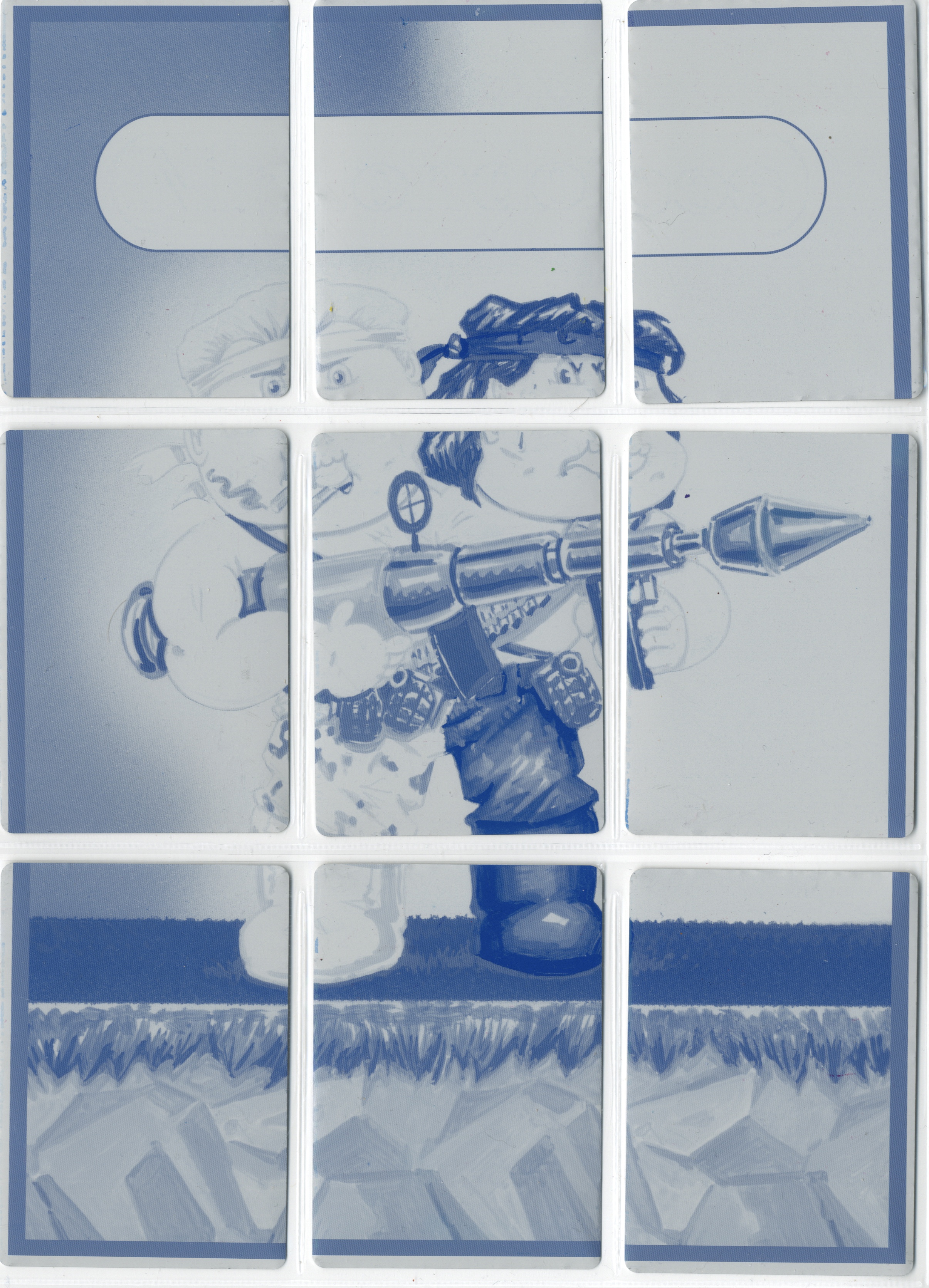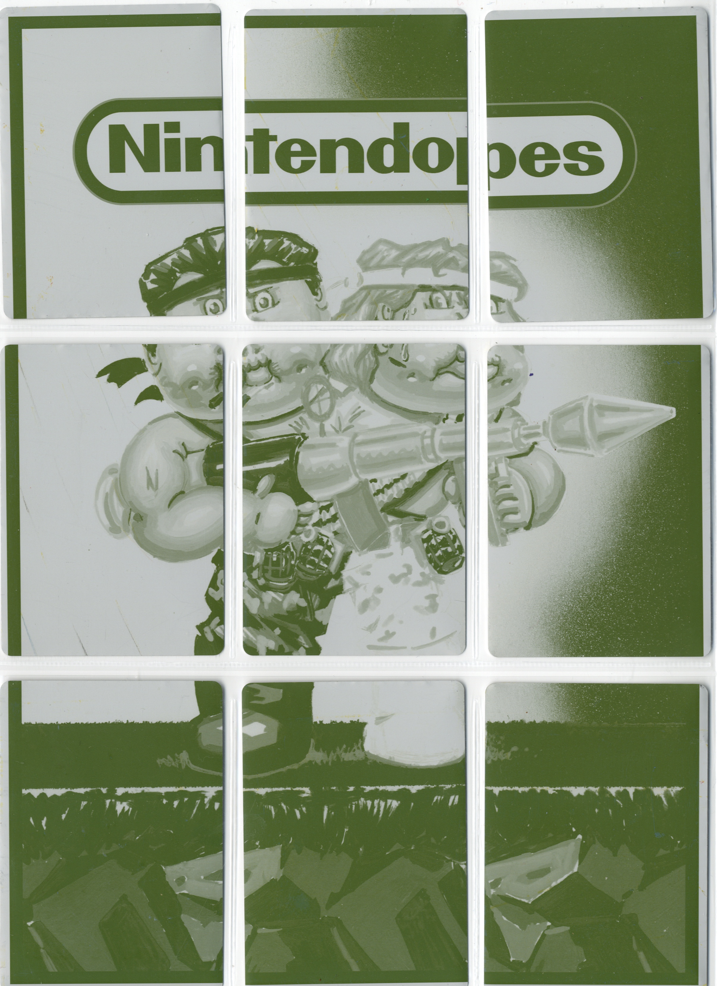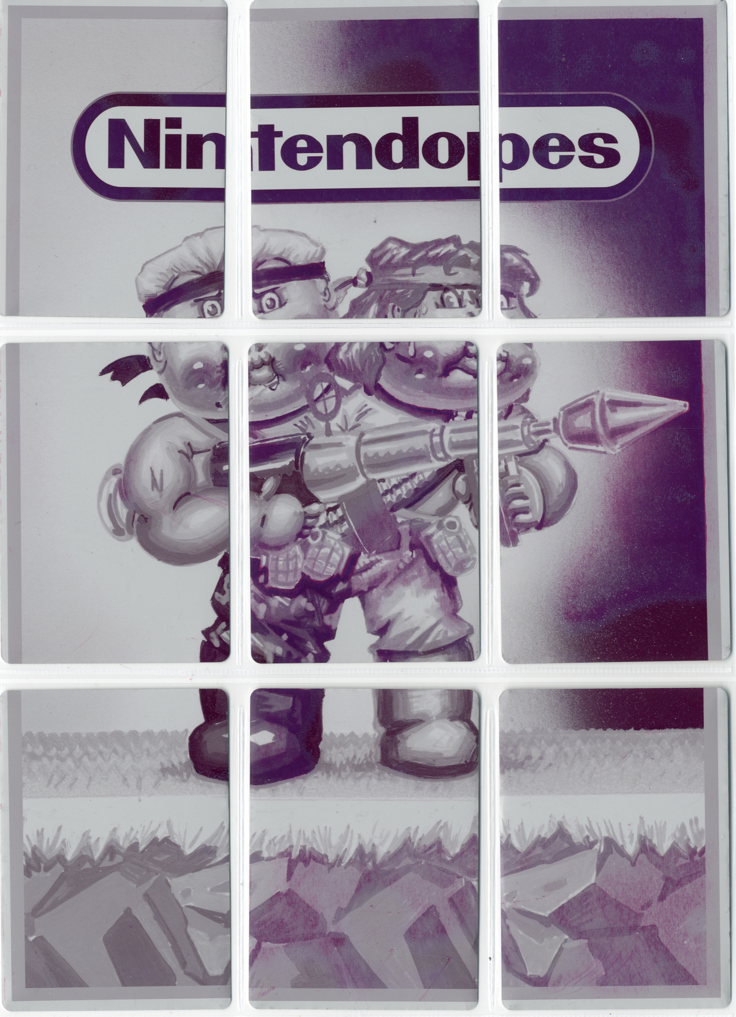These 1/1 metal printing plates were used in the production of Nintendopes, and were cut down to trading card size. There are 4 sets available - CYAN, MAGENTA, YELLOW, and BLACK. These 9 plate sets were used to print one of the 9 card back puzzles.