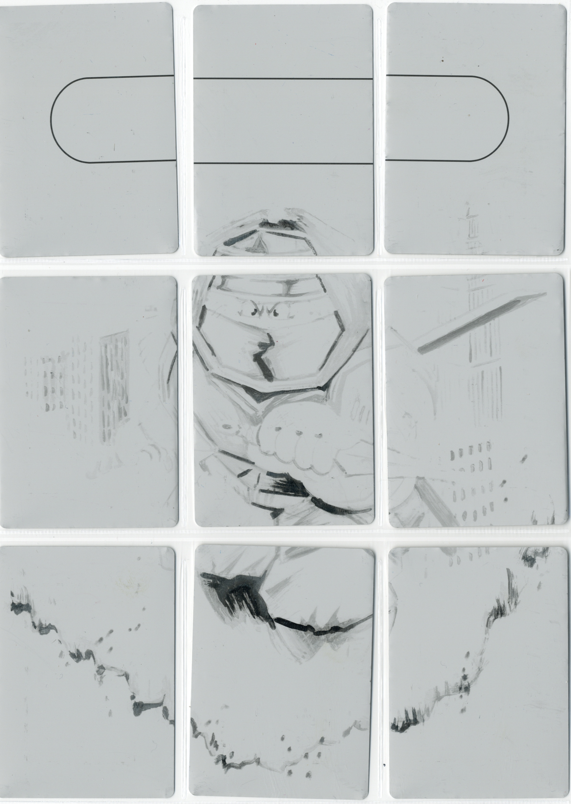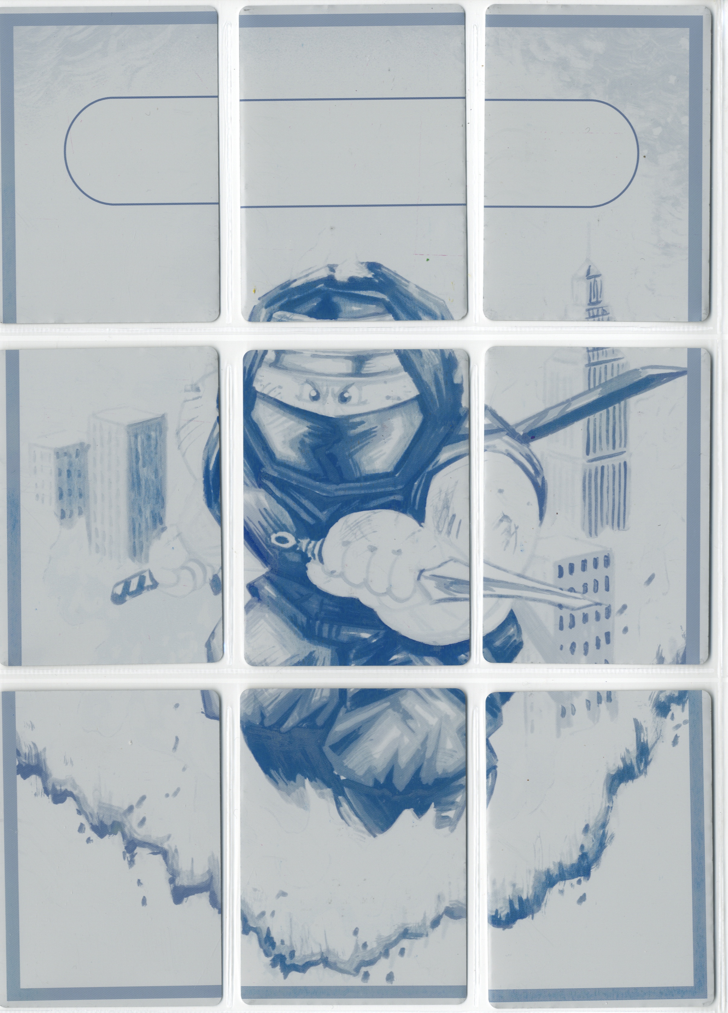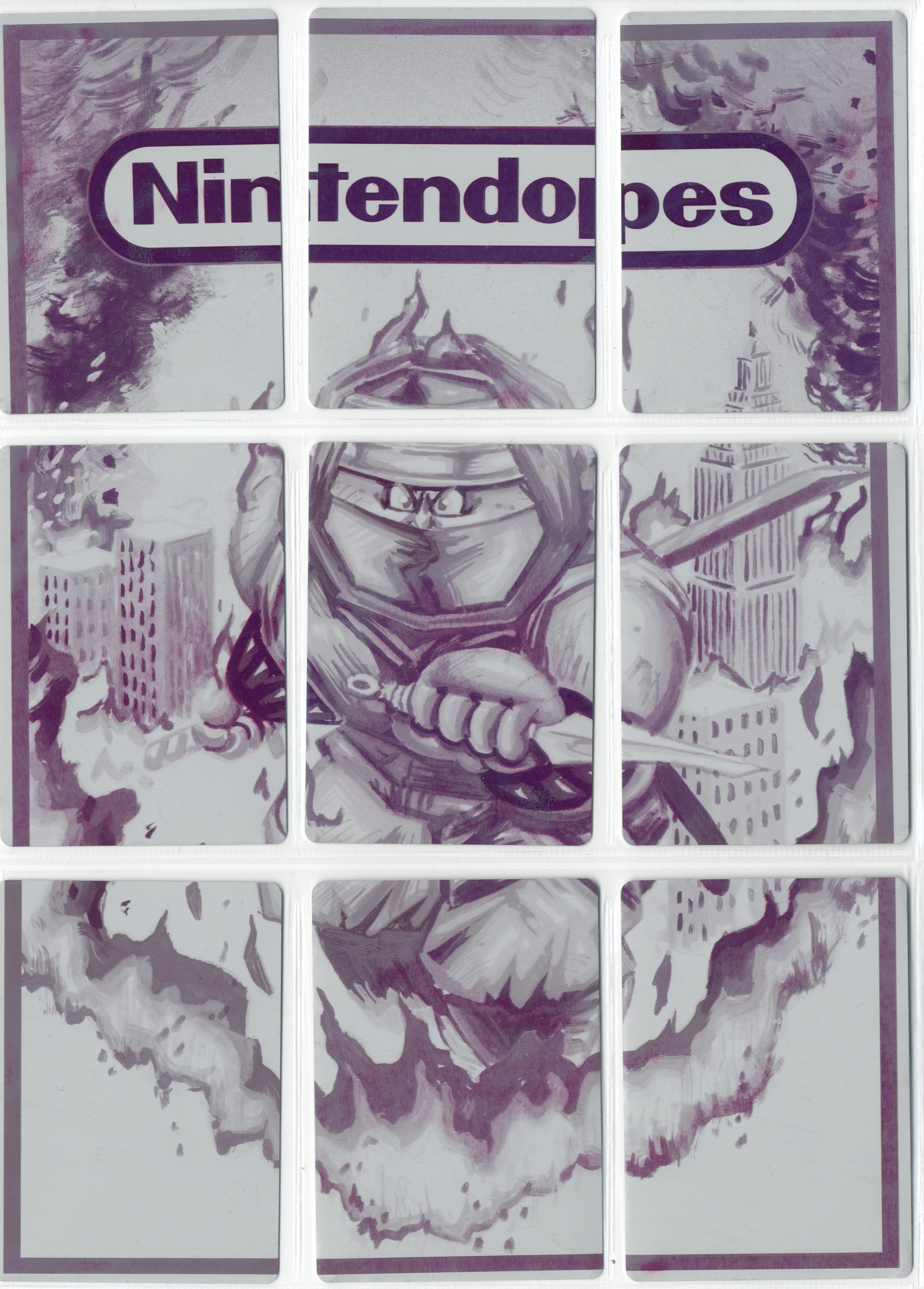 These 1/1 metal printing plates were used in the production of Nintendopes, and were cut down to trading card size. There are 4 sets available - CYAN, MAGENTA, YELLOW, and BLACK. These 9 plate sets were used to print one of the 9 card back puzzles.