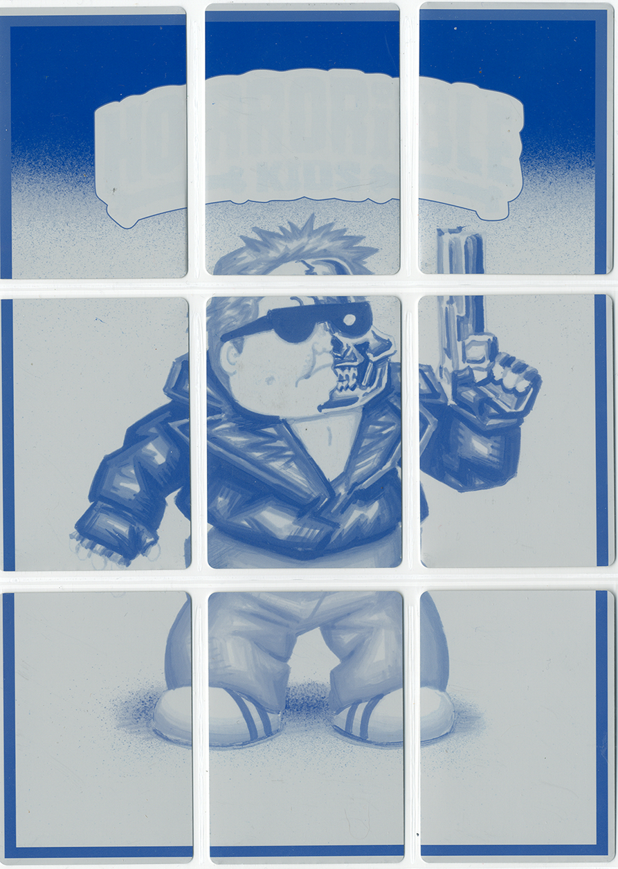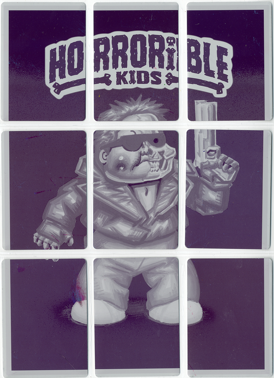 These 1/1 metal printing plates were used in the production of Horrorible Kids, and were cut down to trading card size. There are 4 sets available - CYAN, MAGENTA, YELLOW, and BLACK. These 9 plate sets were used to print one of the 9 card back puzzles.