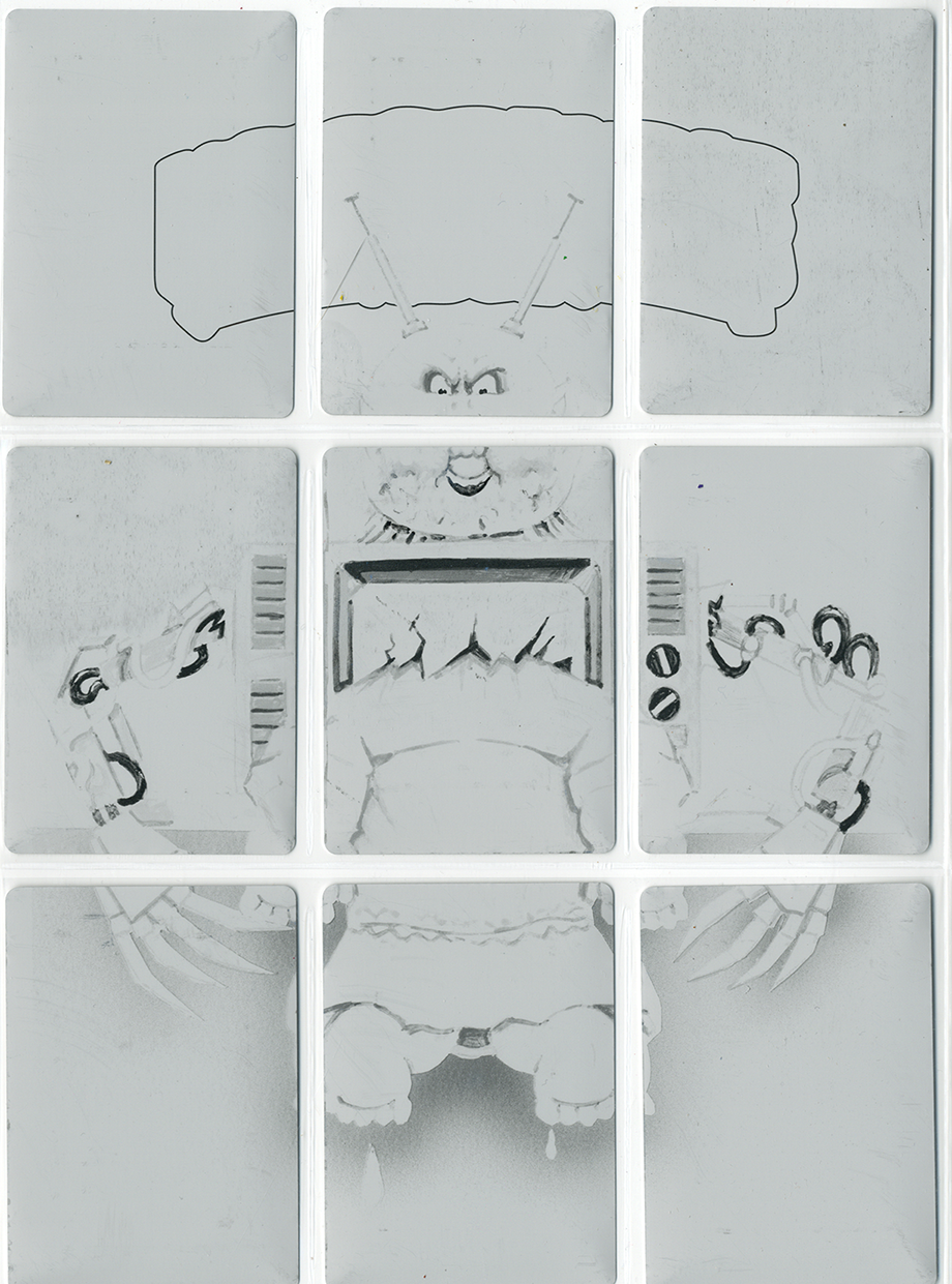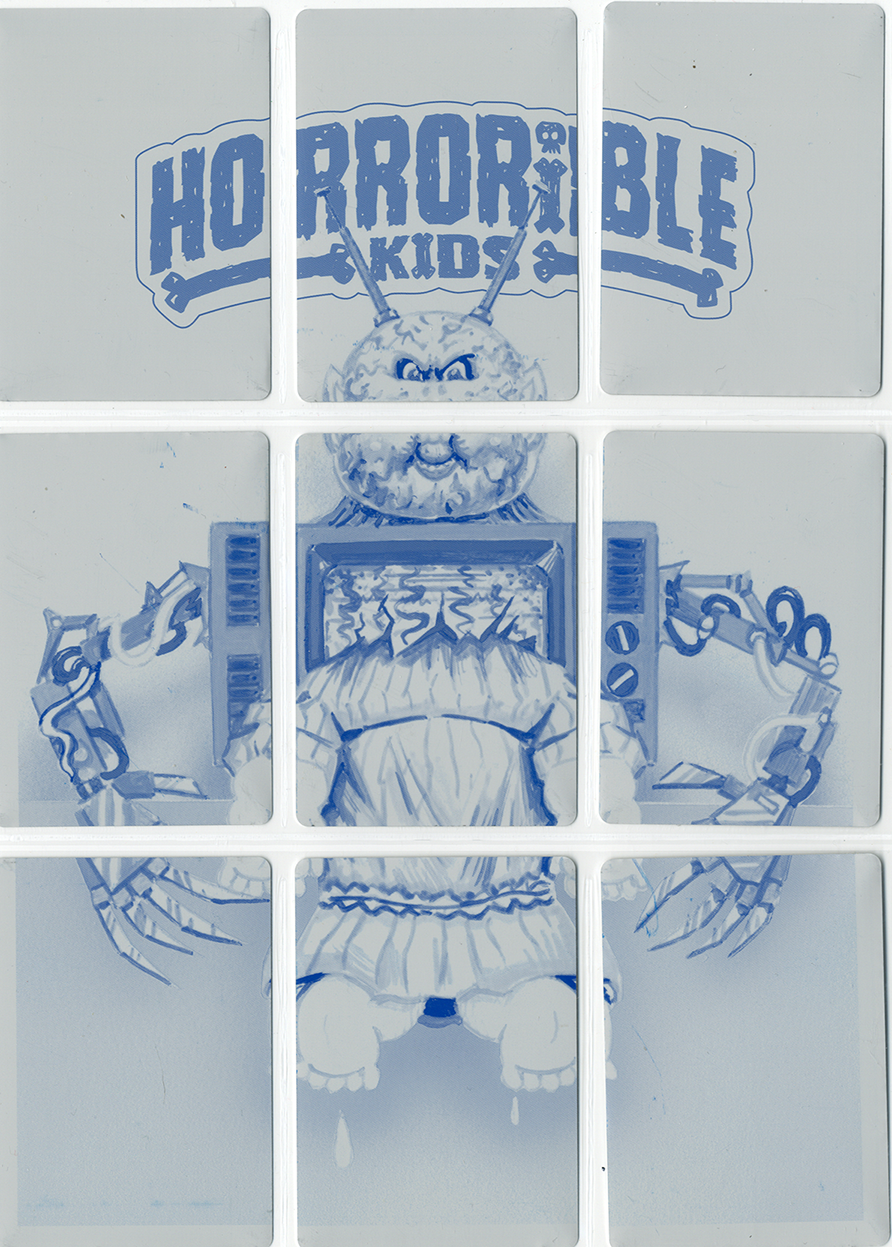 These 1/1 metal printing plates were used in the production of Horrorible Kids, and were cut down to trading card size. There are 4 sets available - CYAN, MAGENTA, YELLOW, and BLACK. These 9 plate sets were used to print one of the 9 card back puzzles.