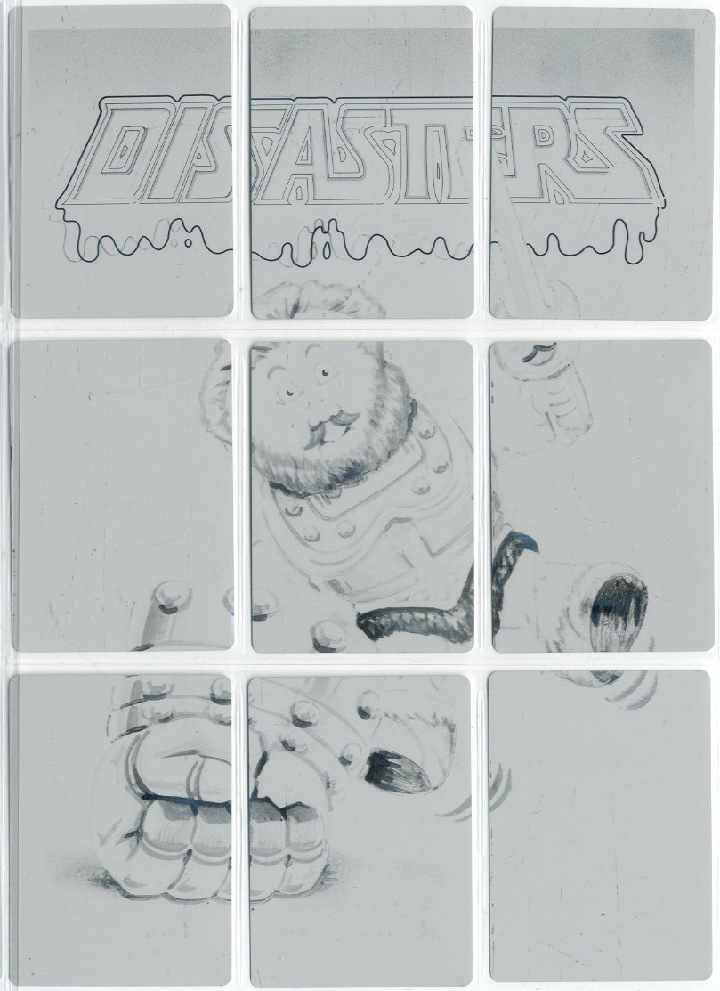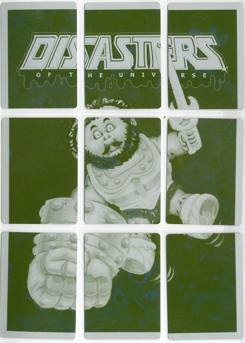 These 1/1 metal printing plates were used in the production of Disasters of the Universe, and were cut down to trading card size. There are 4 sets available - CYAN, MAGENTA, YELLOW, and BLACK. These 9 plate sets were used to print one of the 9 card back puzzles.