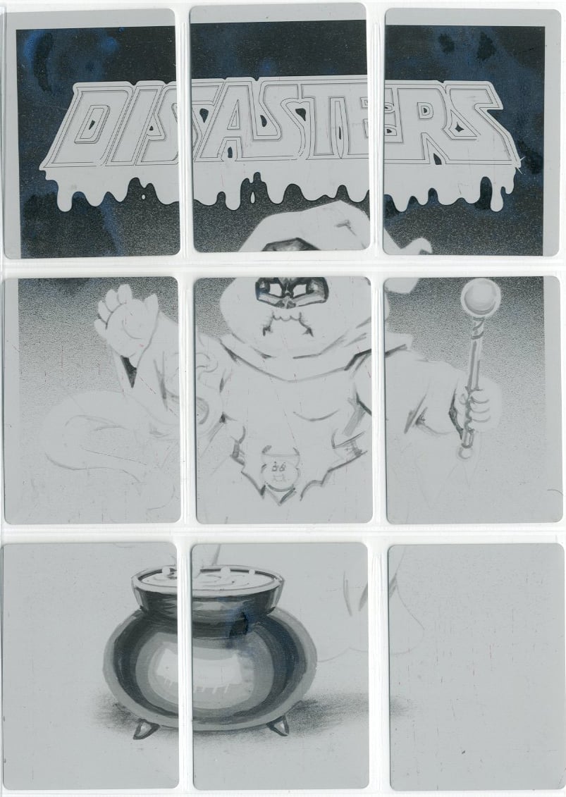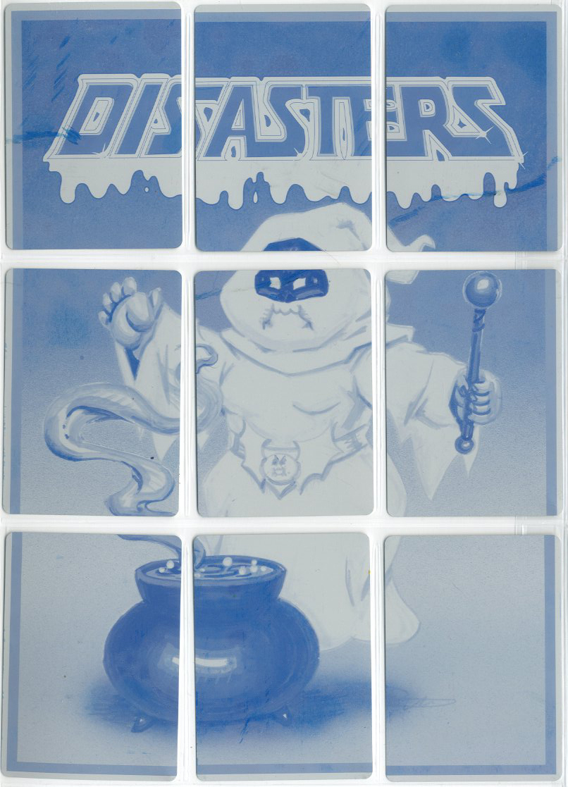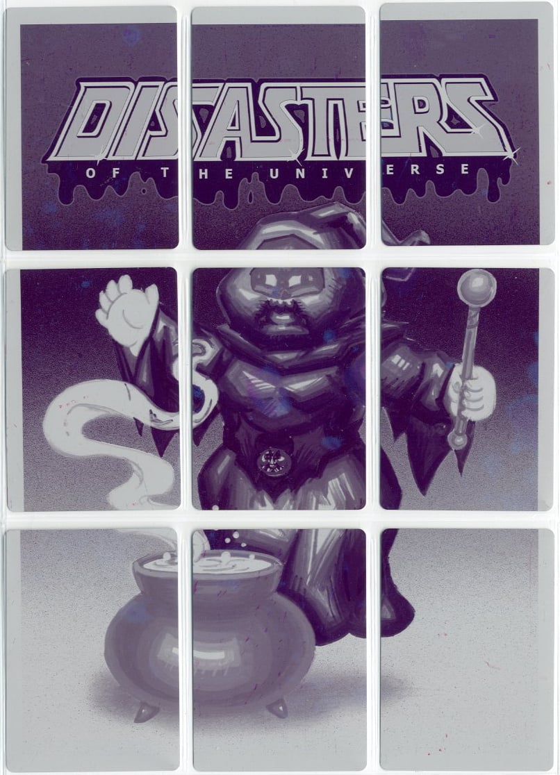 These 1/1 metal printing plates were used in the production of Disasters of the Universe, and were cut down to trading card size. There are 4 sets available - CYAN, MAGENTA, YELLOW, and BLACK. These 9 plate sets were used to print one of the 9 card back puzzles.