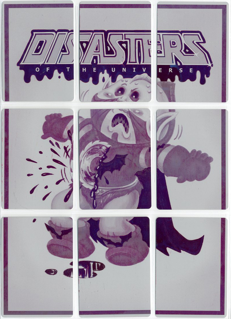 These 1/1 metal printing plates were used in the production of Disasters of the Universe, and were cut down to trading card size. There are 4 sets available - CYAN, MAGENTA, YELLOW, and BLACK. These 9 plate sets were used to print one of the 9 card back puzzles.