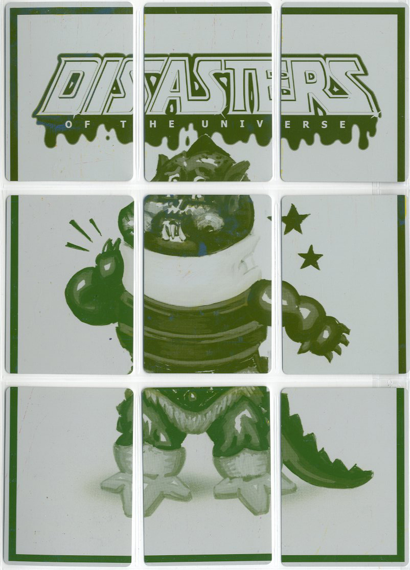 These 1/1 metal printing plates were used in the production of Disasters of the Universe, and were cut down to trading card size. There are 4 sets available - CYAN, MAGENTA, YELLOW, and BLACK. These 9 plate sets were used to print one of the 9 card back puzzles.
