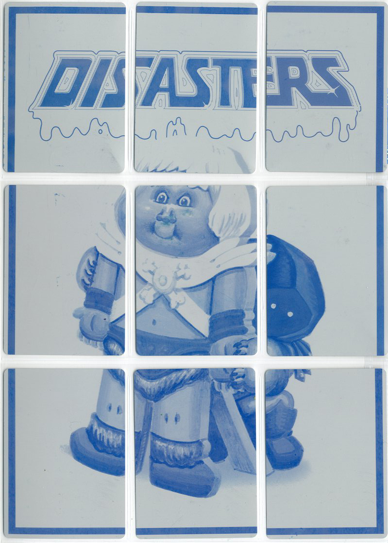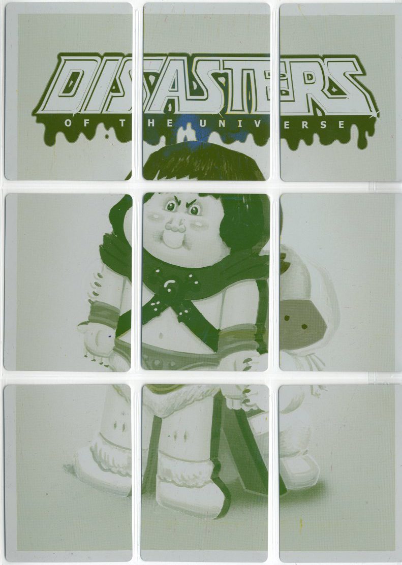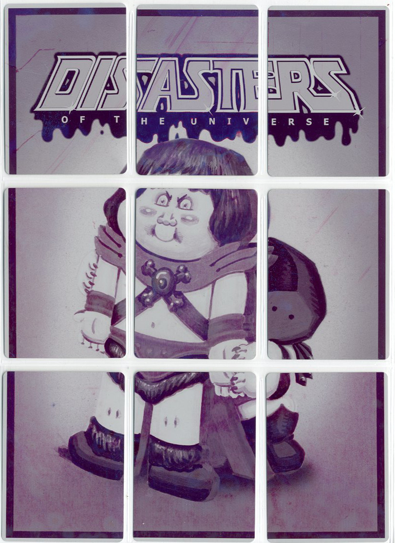 These 1/1 metal printing plates were used in the production of Disasters of the Universe, and were cut down to trading card size. There are 4 sets available - CYAN, MAGENTA, YELLOW, and BLACK. These 9 plate sets were used to print one of the 9 card back puzzles.