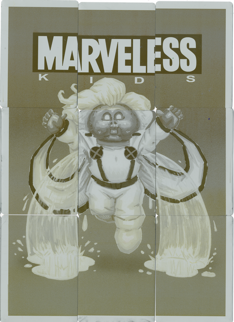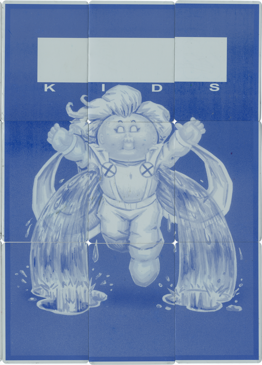 These 1/1 metal printing plates were used in the production of Marveless Kids, and were cut down to trading card size. There are 4 sets available - CYAN, MAGENTA, YELLOW, and BLACK. These 9 plate sets were used to print one of the 9 card back puzzles.
