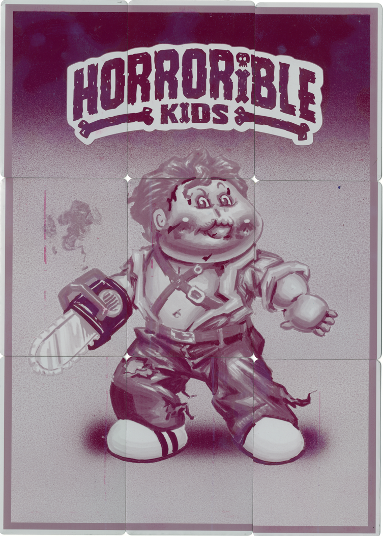 These 1/1 metal printing plates were used in the production of Horrorible Kids, and were cut down to trading card size. There are 4 sets available - CYAN, MAGENTA, YELLOW, and BLACK. These 9 plate sets were used to print one of the 9 card back puzzles.