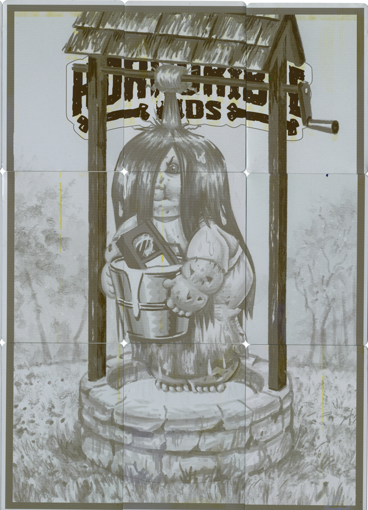These 1/1 metal printing plates were used in the production of Horrorible Kids, and were cut down to trading card size. There are 4 sets available - CYAN, MAGENTA, YELLOW, and BLACK. These 9 plate sets were used to print one of the 9 card back puzzles.