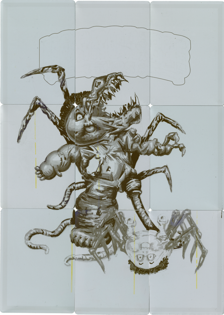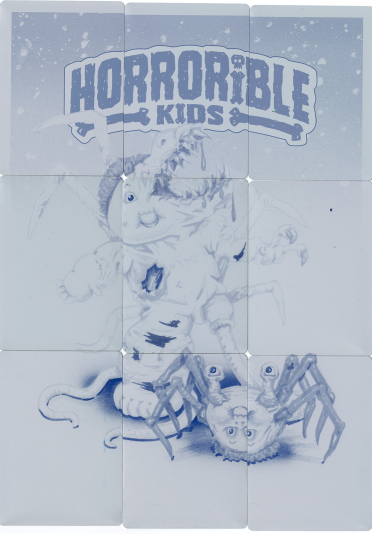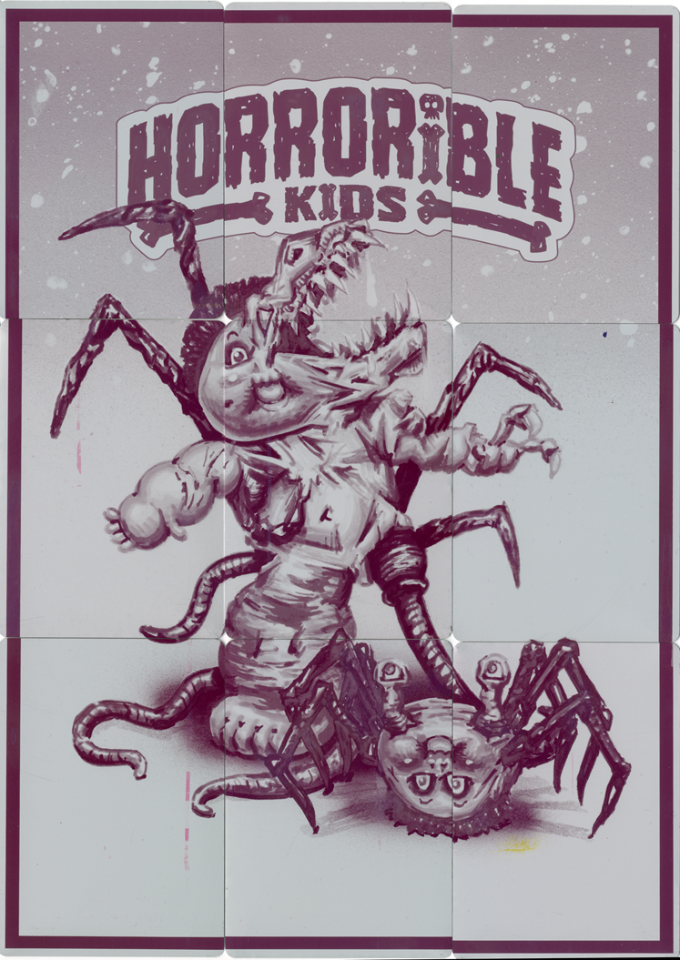 These 1/1 metal printing plates were used in the production of Horrorible Kids, and were cut down to trading card size. There are 4 sets available - CYAN, MAGENTA, YELLOW, and BLACK. These 9 plate sets were used to print one of the 9 card back puzzles.
