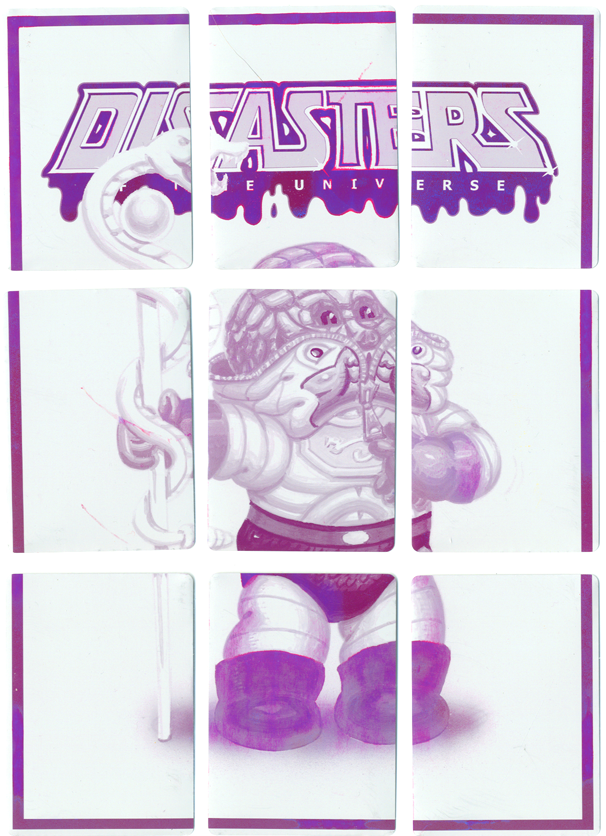 These 1/1 metal printing plates were used in the production of Disasters of the Universe, and were cut down to trading card size. There are 4 sets available - CYAN, MAGENTA, YELLOW, and BLACK. These 9 plate sets were used to print one of the 9 card back puzzles.