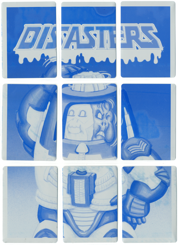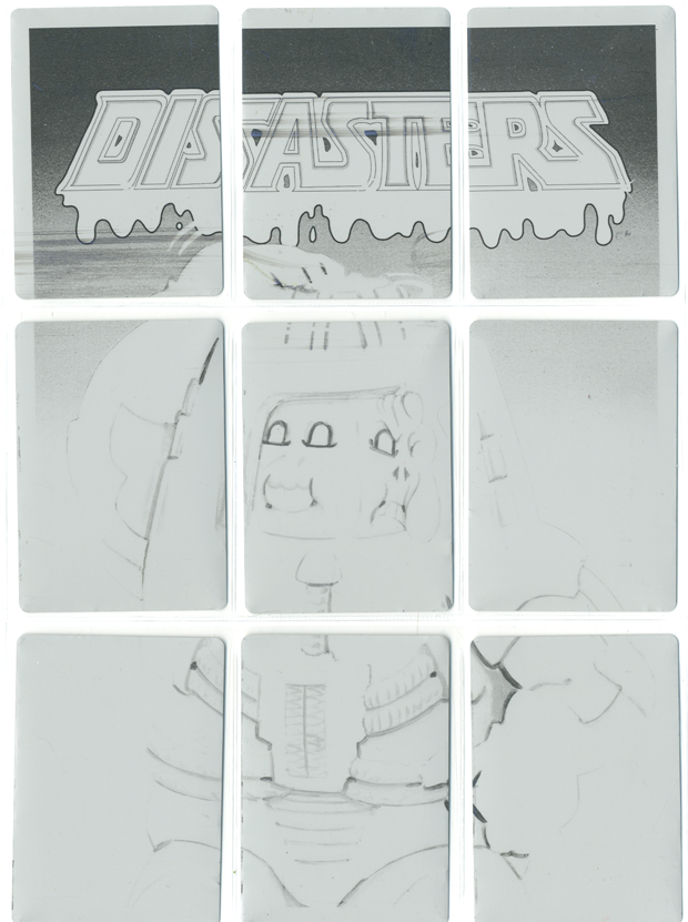 These 1/1 metal printing plates were used in the production of Disasters of the Universe, and were cut down to trading card size. There are 4 sets available - CYAN, MAGENTA, YELLOW, and BLACK. These 9 plate sets were used to print one of the 9 card back puzzles.
