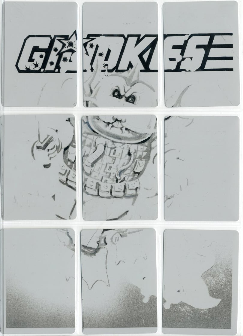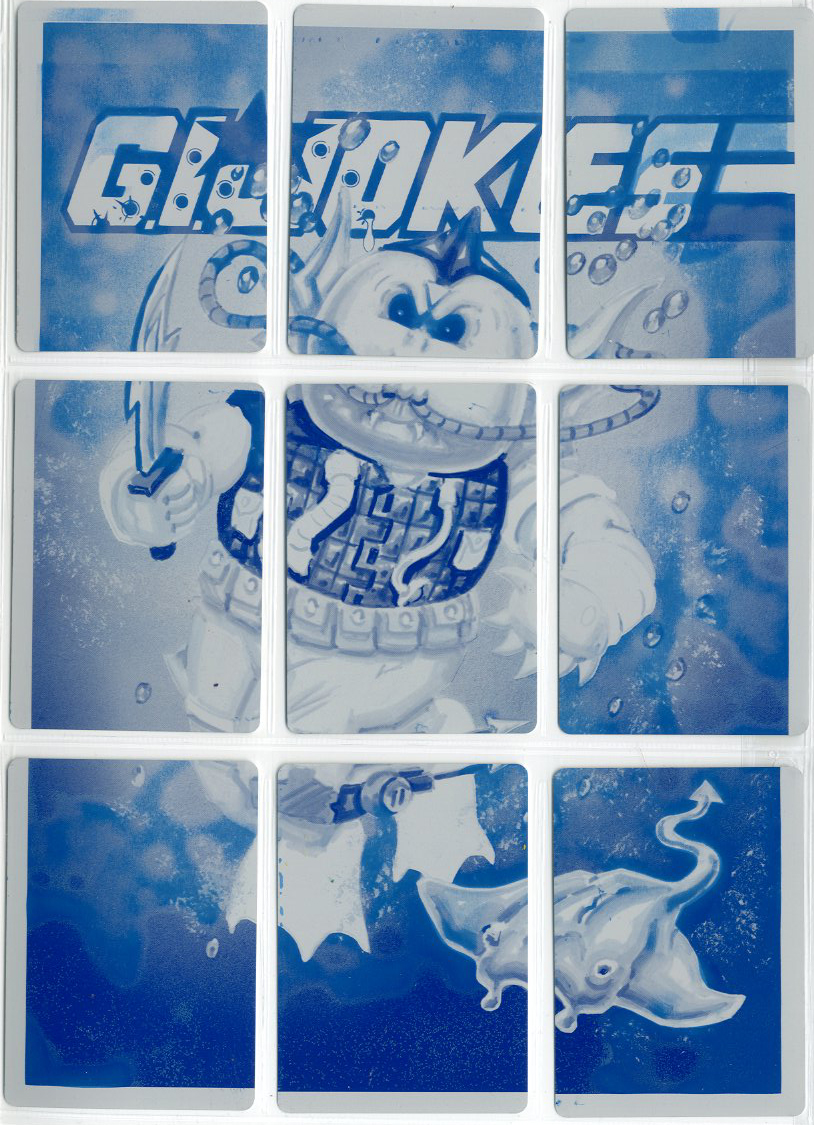 These 1/1 metal printing plates were used in the production of G.I. Jokes, and were cut down to trading card size. There are 4 sets available - CYAN, MAGENTA, YELLOW, and BLACK. These 9 plate sets were used to print one of the 9 card back puzzles.