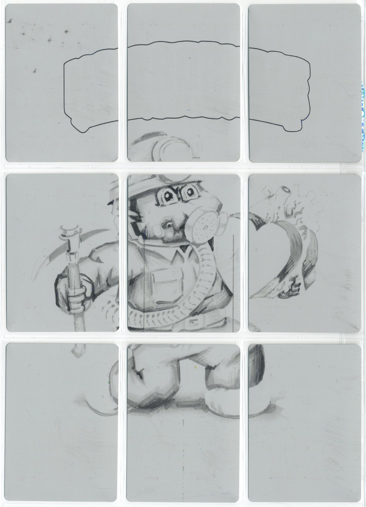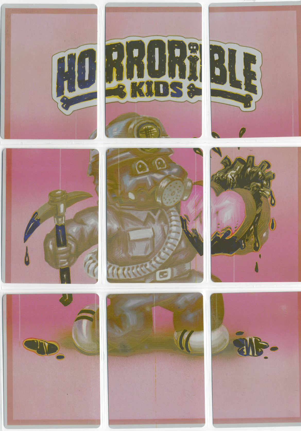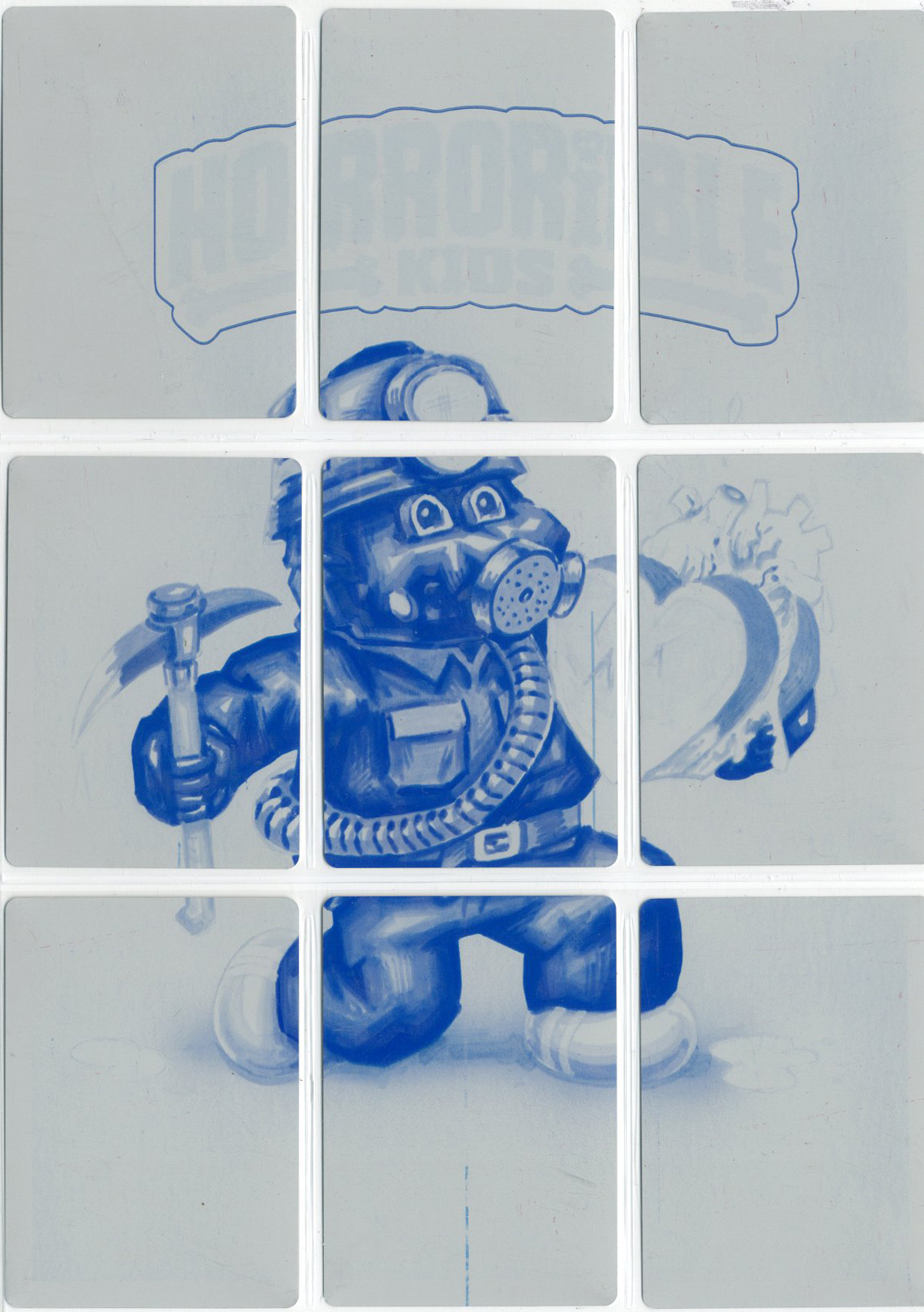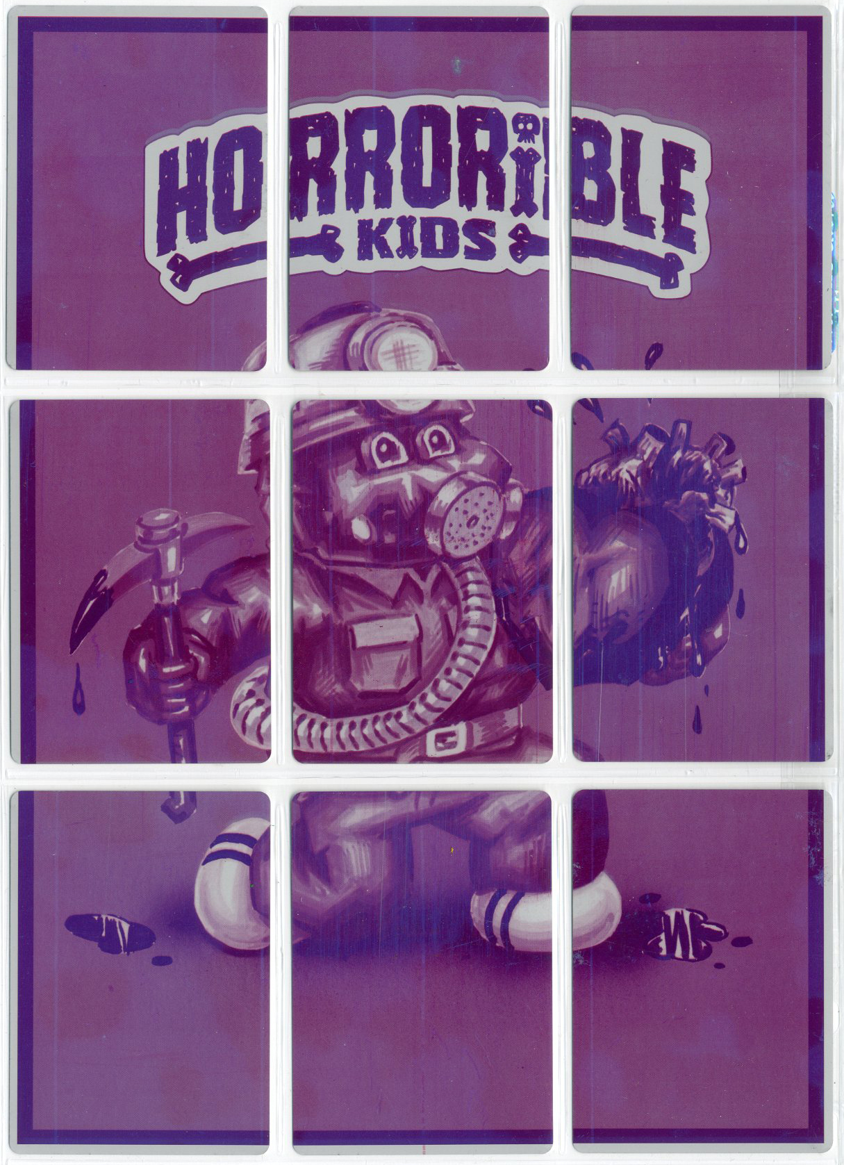 These 1/1 metal printing plates were used in the production of Horrorible Kids, and were cut down to trading card size. There are 4 sets available - CYAN, MAGENTA, YELLOW, and BLACK. These 9 plate sets were used to print one of the 9 card back puzzles.