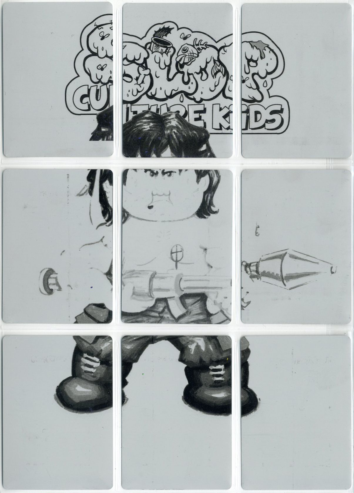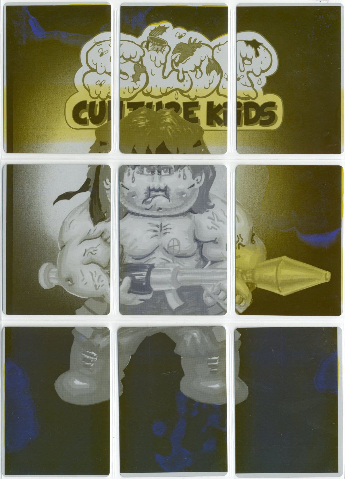 These 1/1 metal printing plates were used in the production of Horrorible Kids, and were cut down to trading card size. There are 4 sets available - CYAN, MAGENTA, YELLOW, and BLACK. These 9 plate sets were used to print one of the 9 card back puzzles.