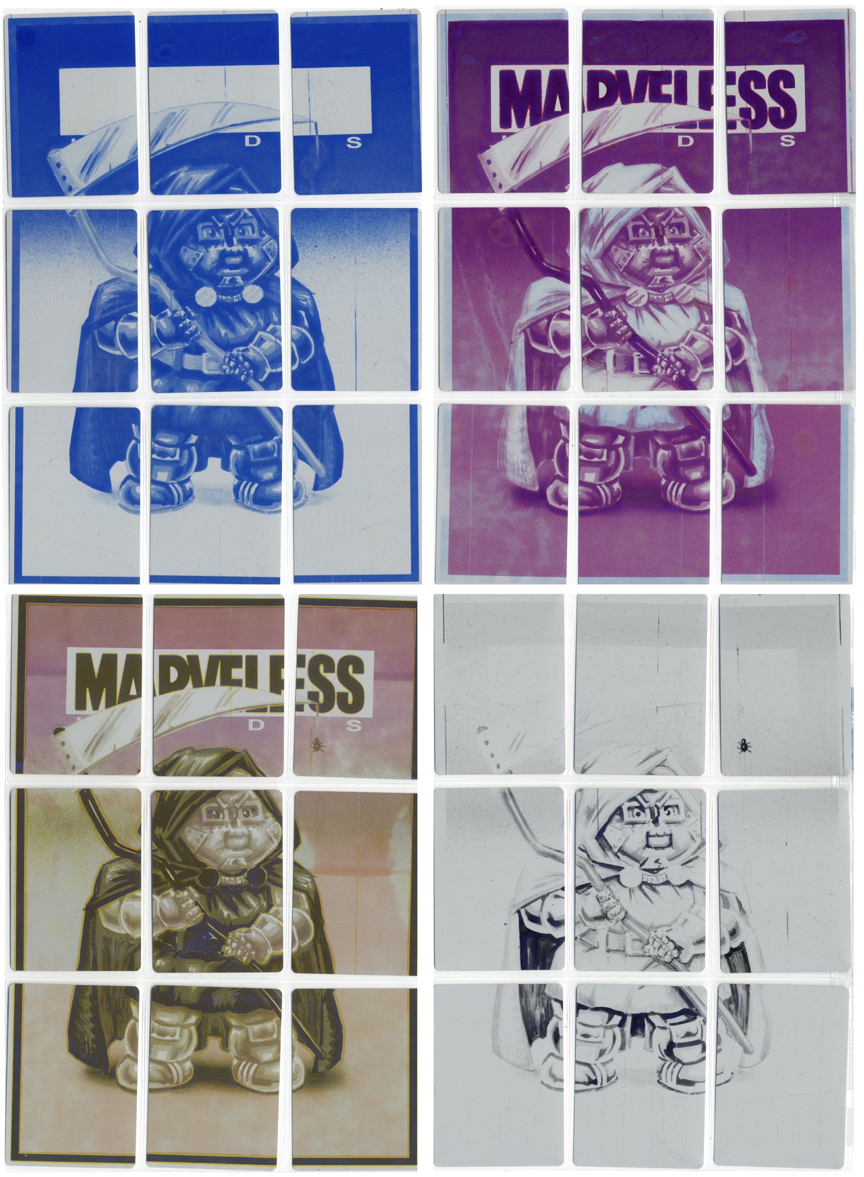 These 1/1 metal printing plates were used in the production of the set and were cut down to trading card size. There are 4 sets available - CYAN, MAGENTA, YELLOW, and BLACK. These 9 plate sets were used to print one of the 9 card back puzzles.