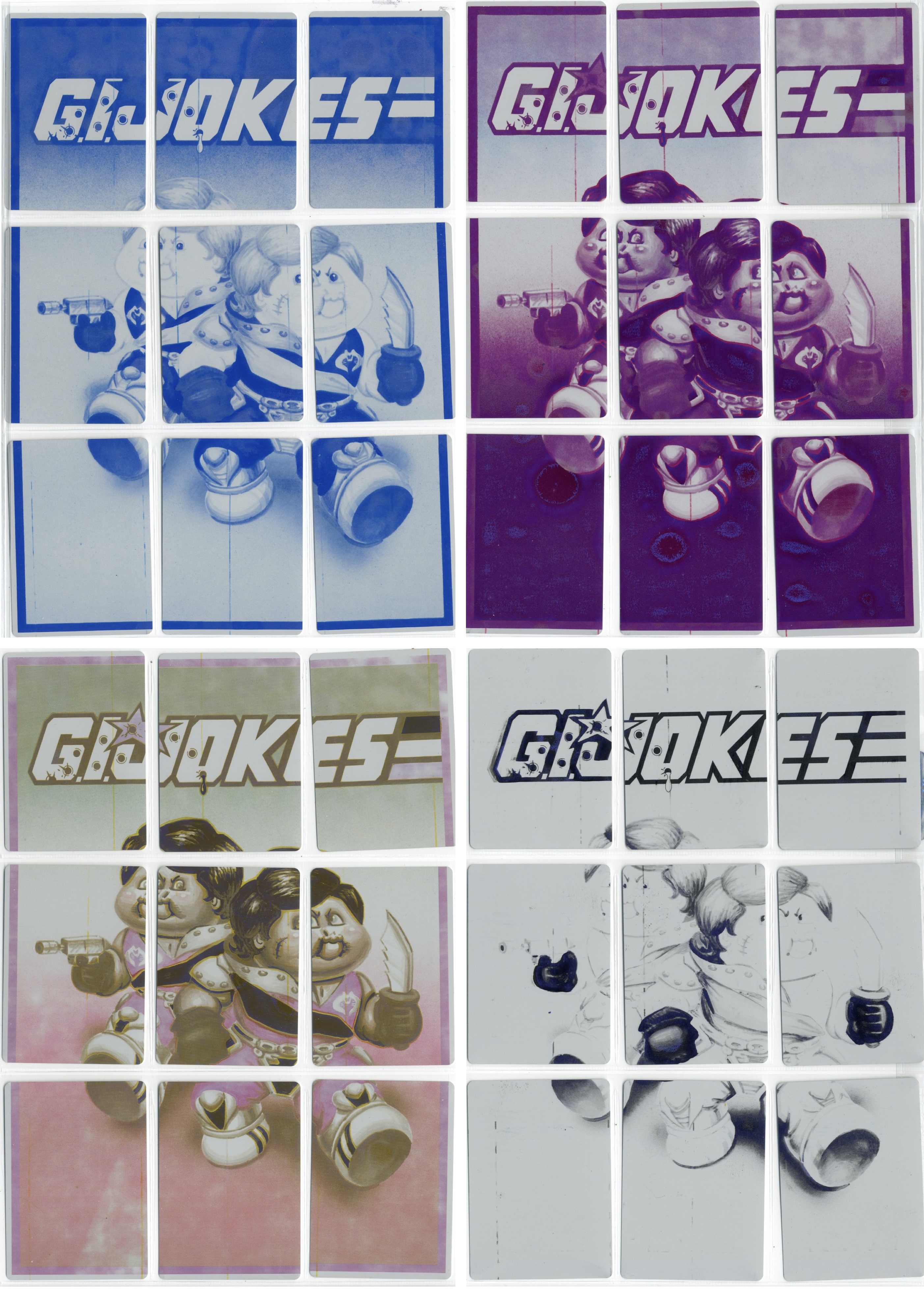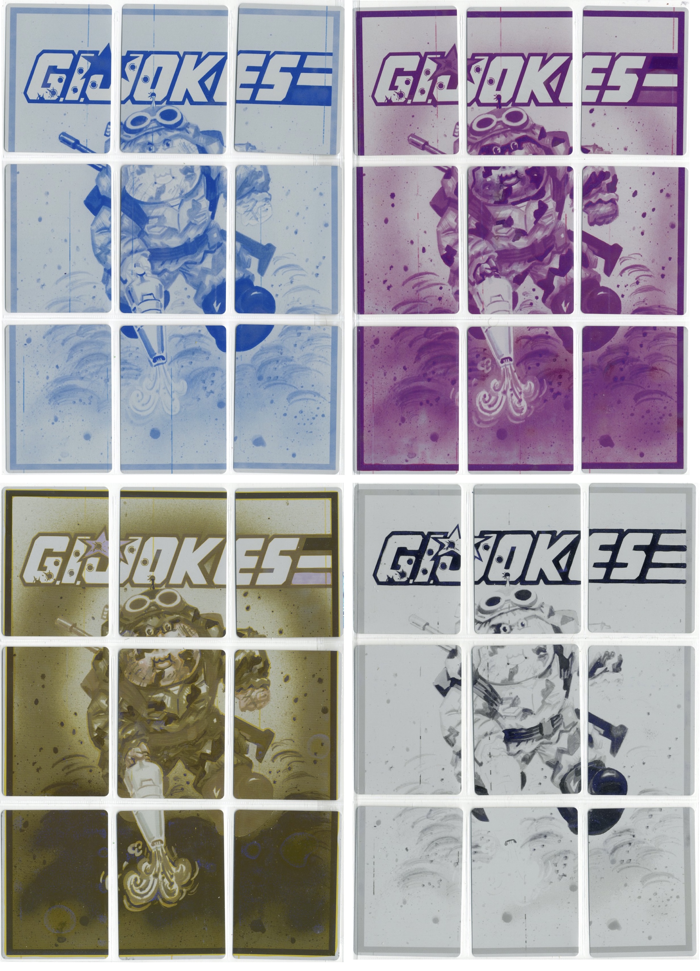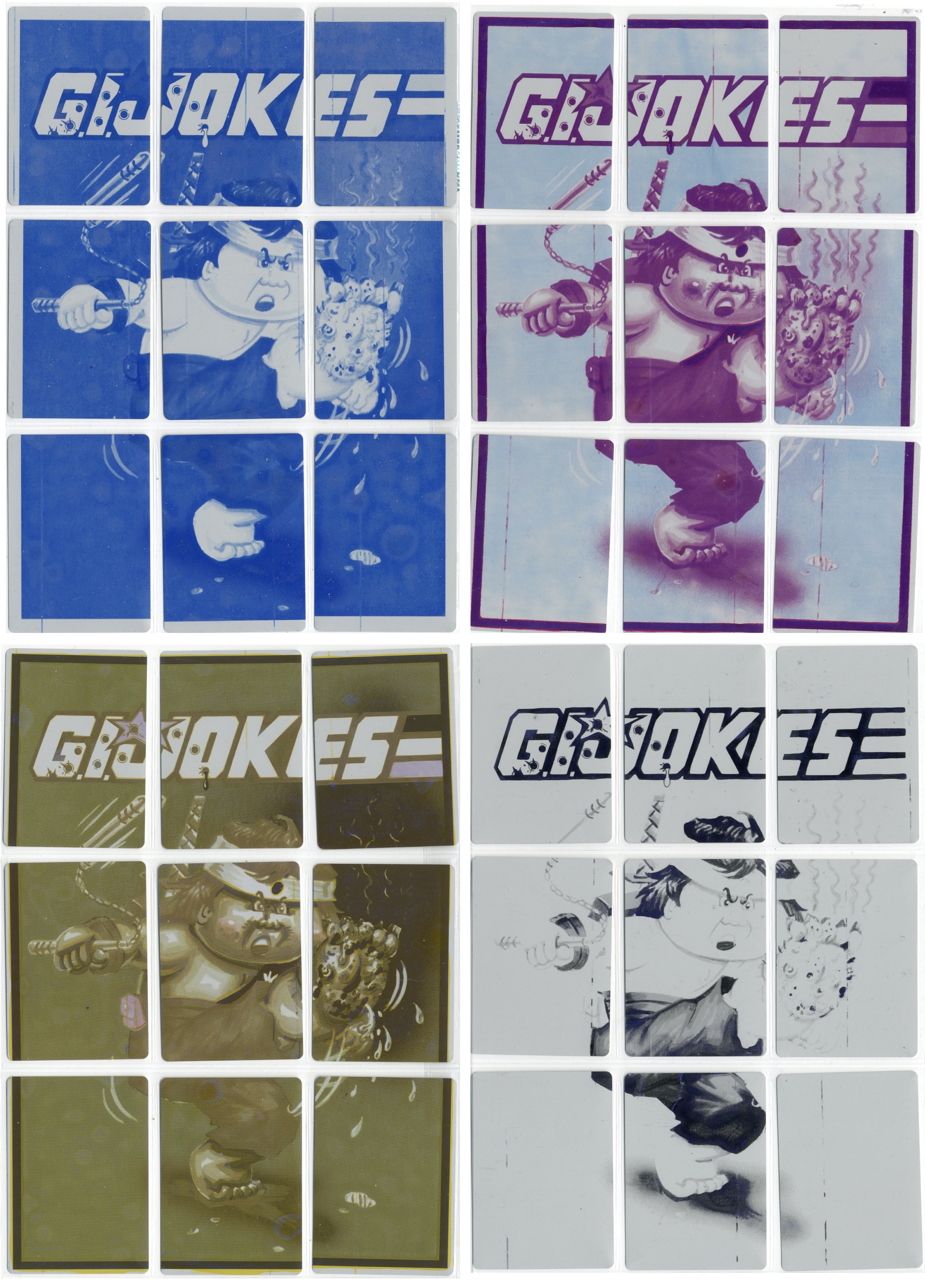 These 1/1 metal printing plates were used in the production of the set and were cut down to trading card size. There are 4 sets available - CYAN, MAGENTA, YELLOW, and BLACK. These 9 plate sets were used to print one of the 9 card back puzzles.