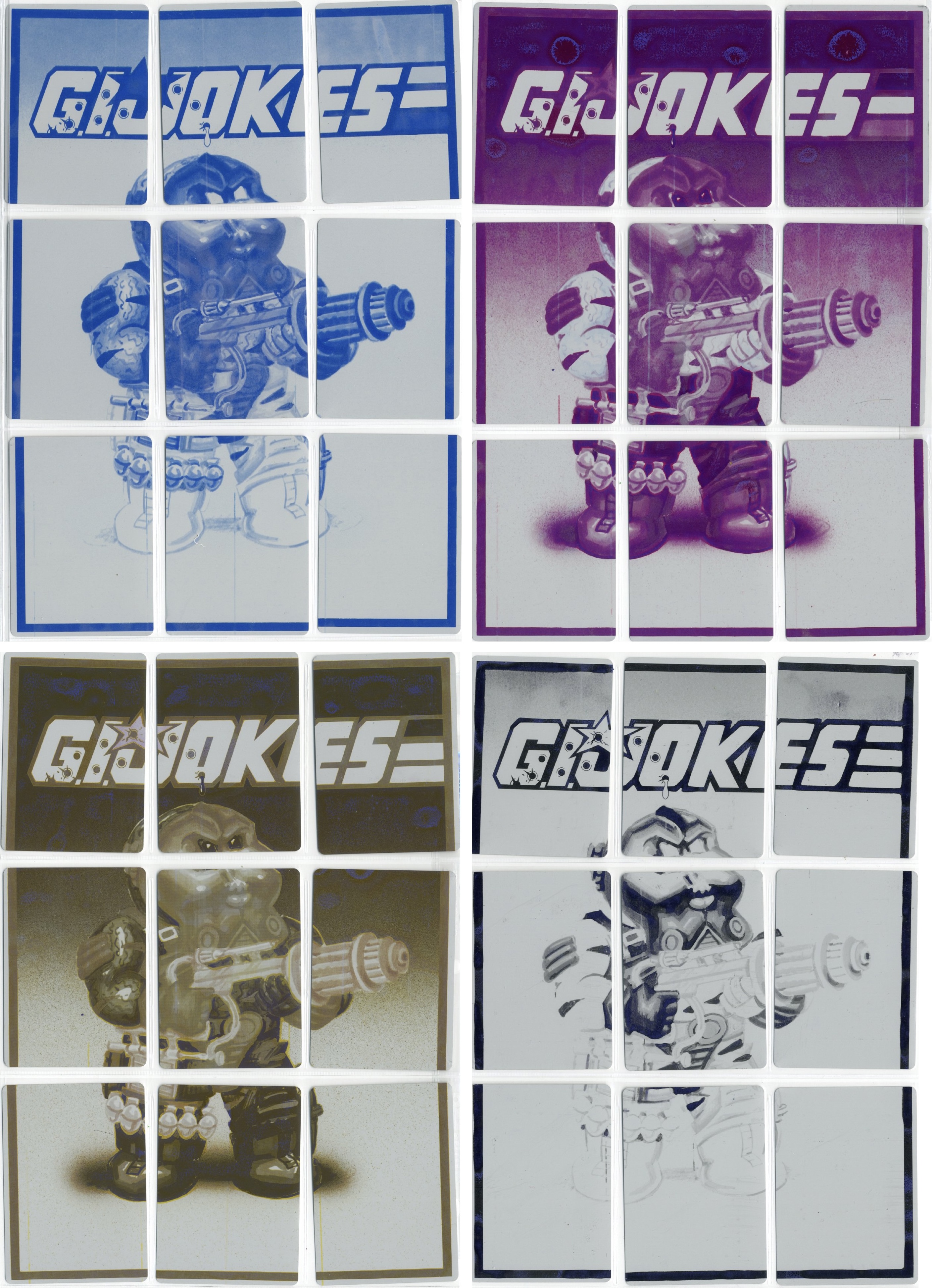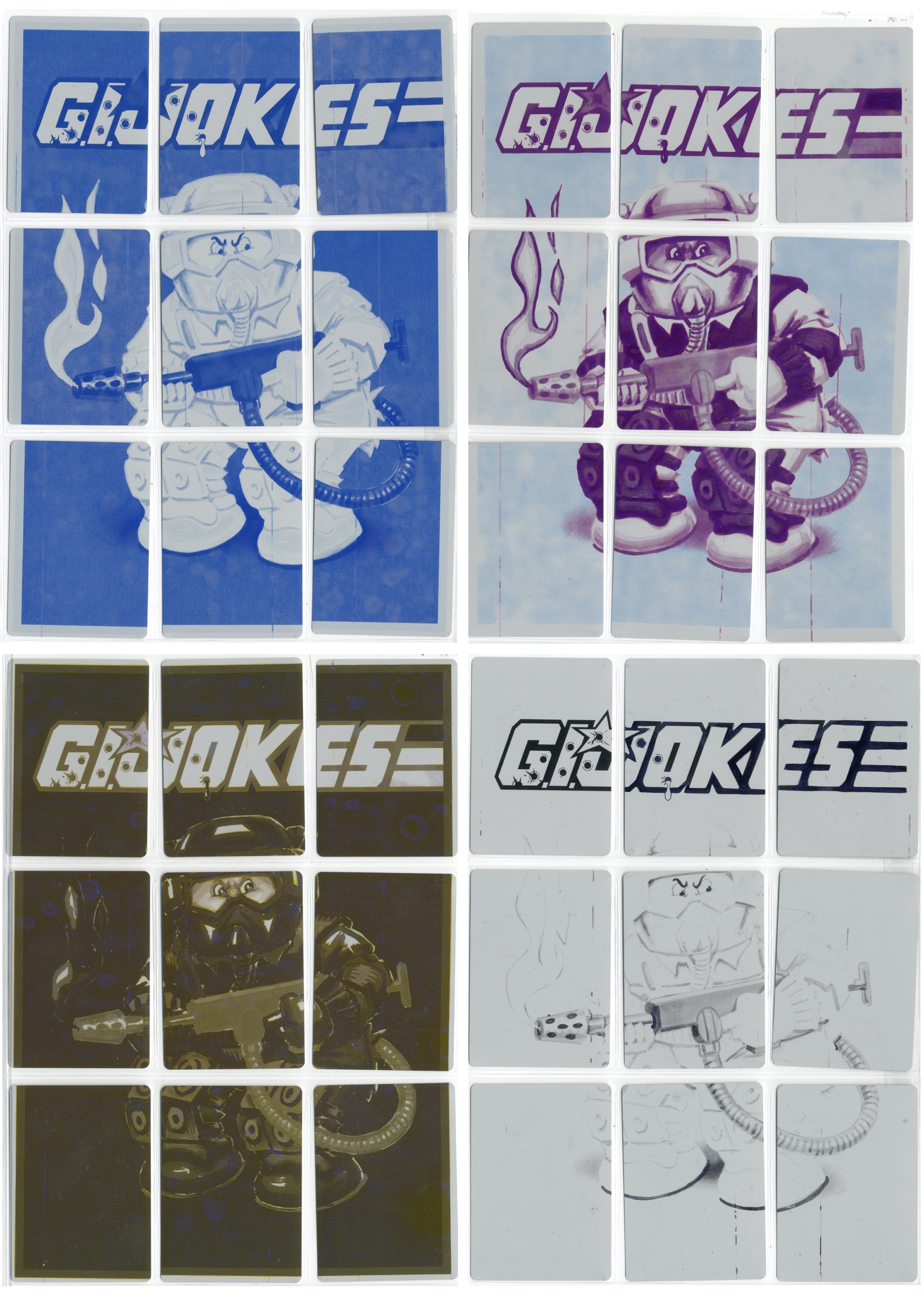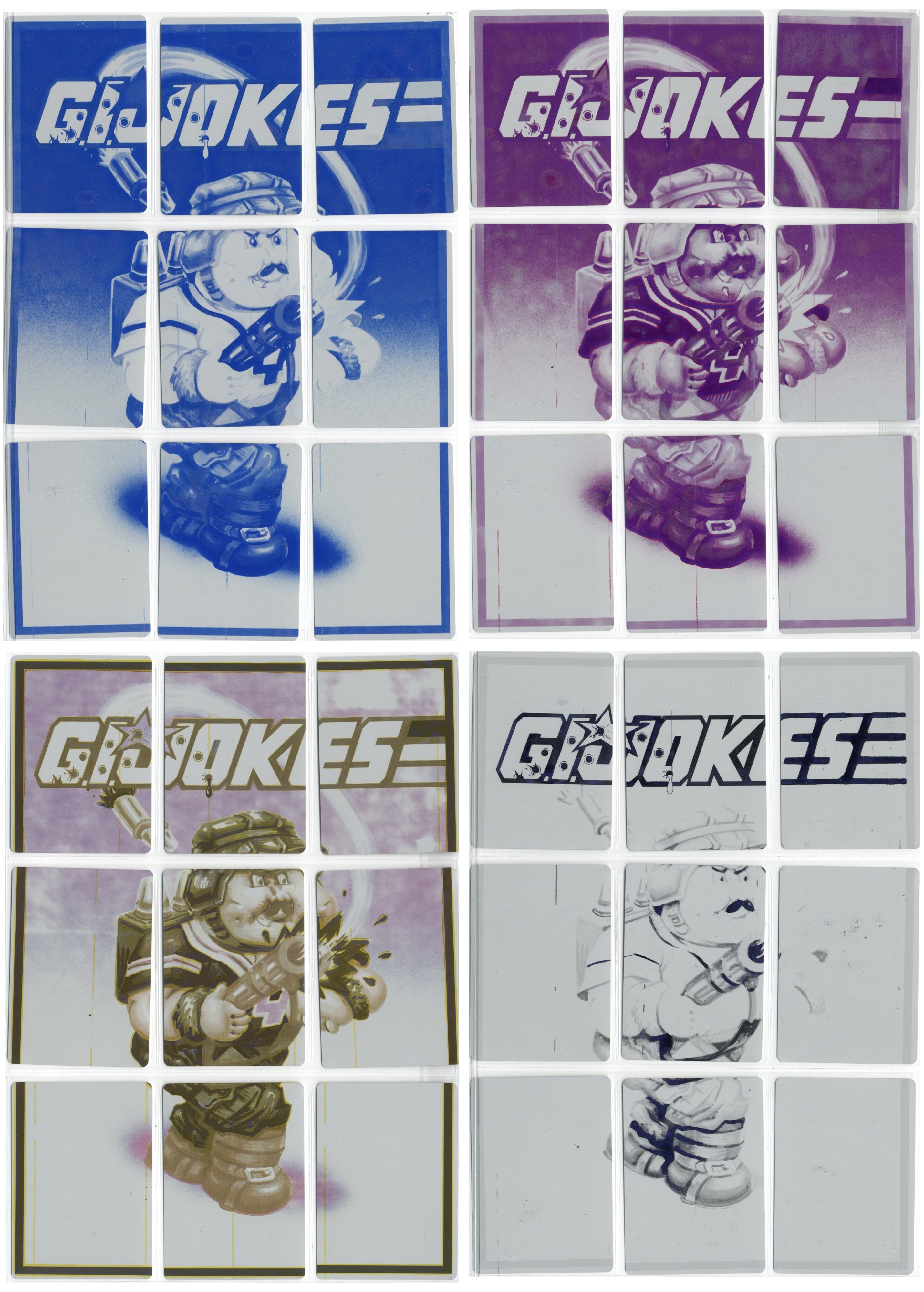 These 1/1 metal printing plates were used in the production of the set and were cut down to trading card size. There are 4 sets available - CYAN, MAGENTA, YELLOW, and BLACK. These 9 plate sets were used to print one of the 9 card back puzzles.