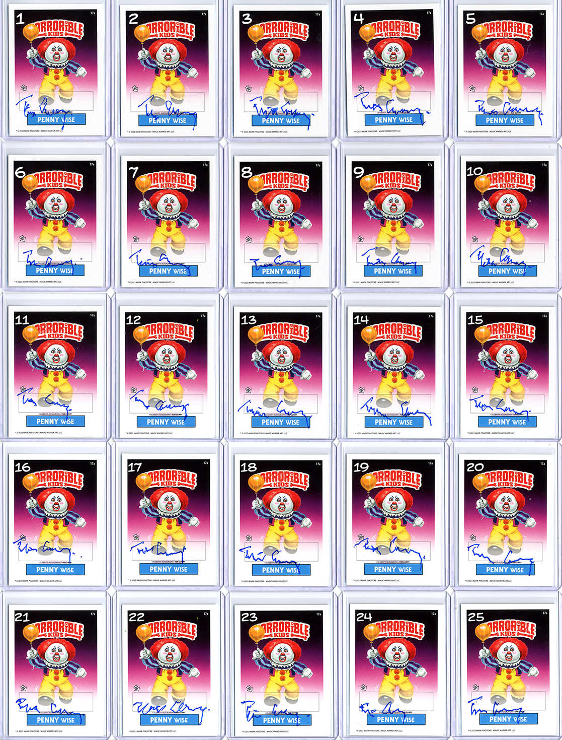 Cards signed by the celebrity on the front, and by the artist on the back. Each card is foil stamped on the back /50, and has an official Tim Curry hologram authentication sticker.