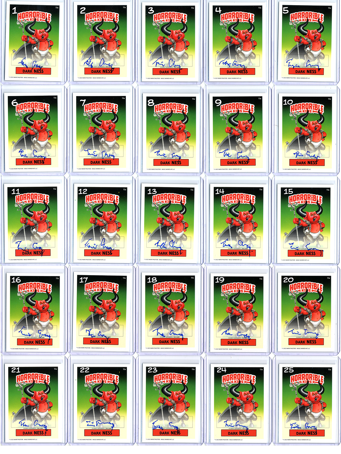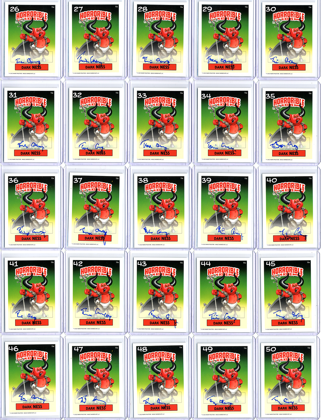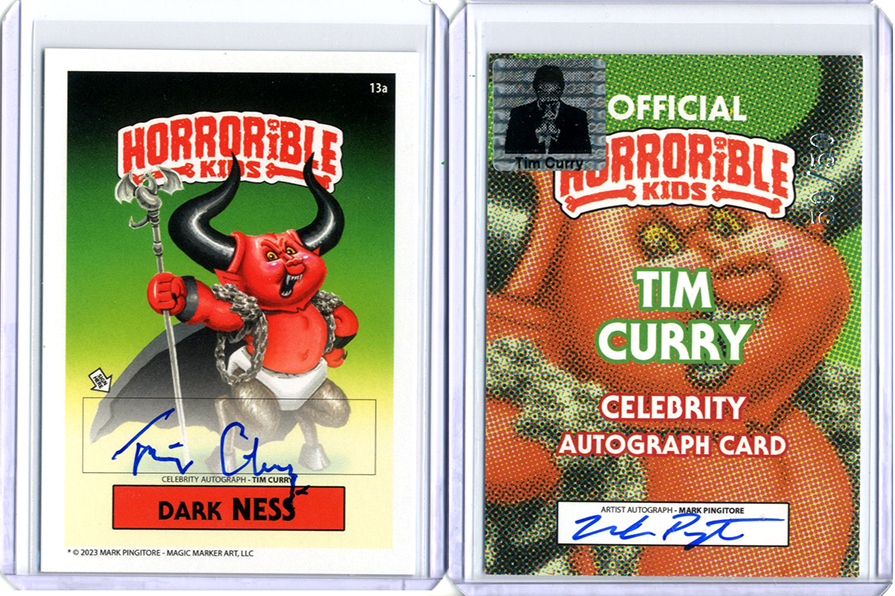 Cards signed by the celebrity on the front, and by the artist on the back. Each card is foil stamped on the back /50, and has an official Tim Curry hologram authentication sticker.