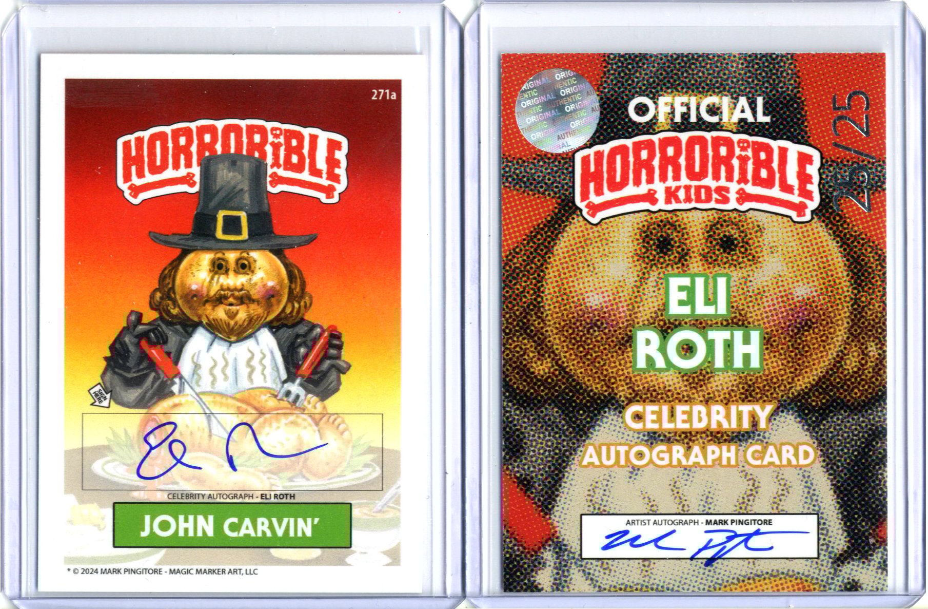 These cards were signed by Eli Roth on the front, and by the artist on the back. Each card is foil stamped on the back /25 and has a hologram to show they are officially verified authentic by me.